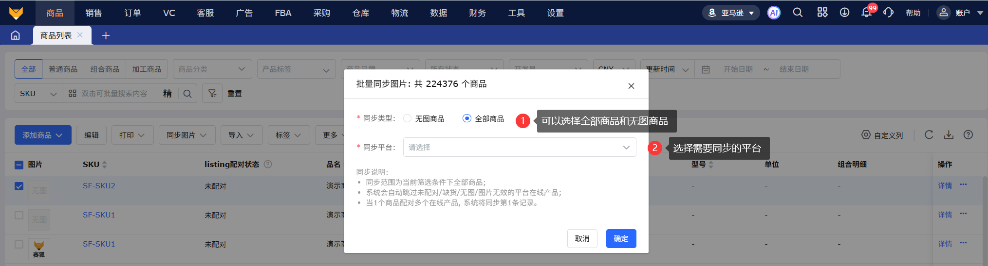 同步Listing图片时,暂不同步不可售且为多变体的Listing图片;本身无图的Listing会跳过同步。