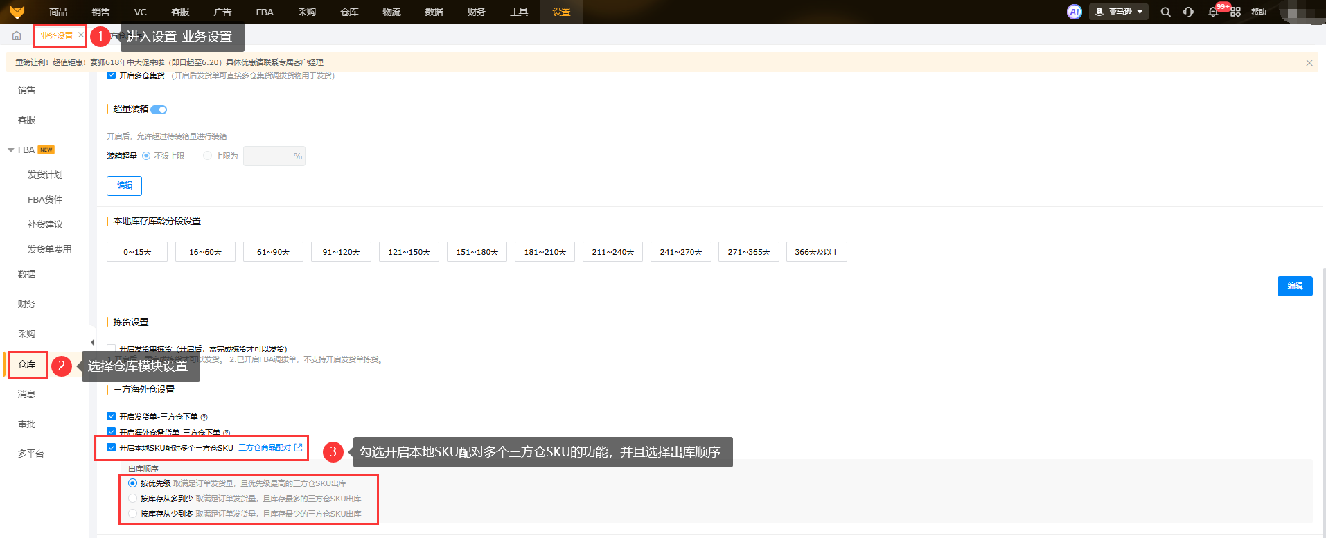 此外,如果用户有多个三方仓SKU配对同一个本地SKU的需求的话,可以在 【设置-业务设置-仓库-三方海外仓设置 】中勾选开启本地SKU配对多个三方仓SKU选项,并选择出库顺序