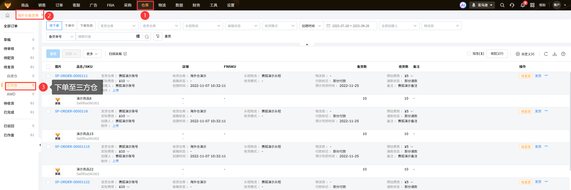 支持在赛狐完成自发货订单的三方仓发货;
