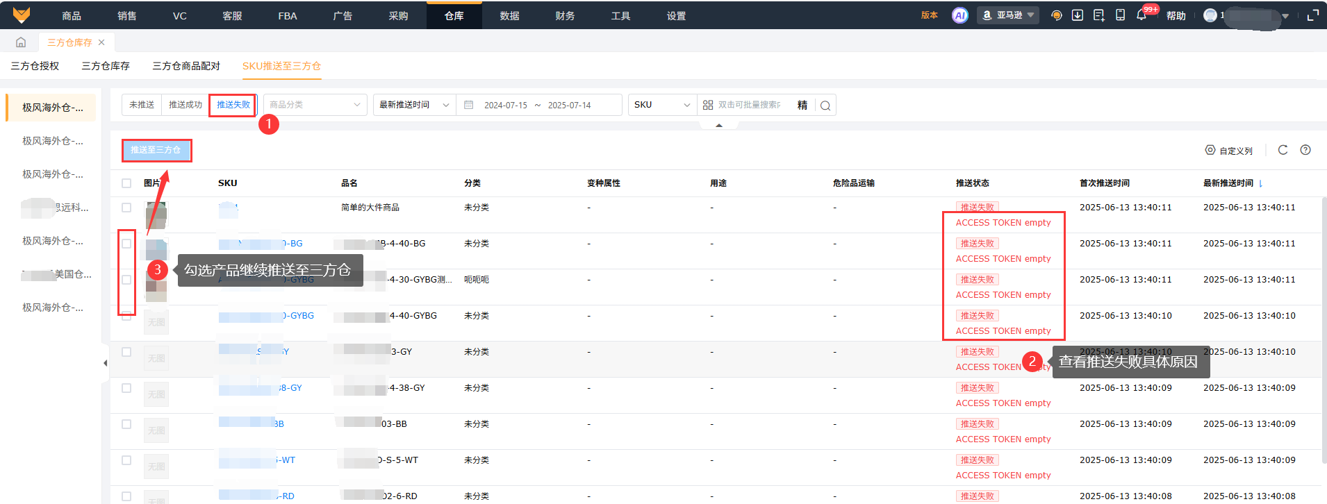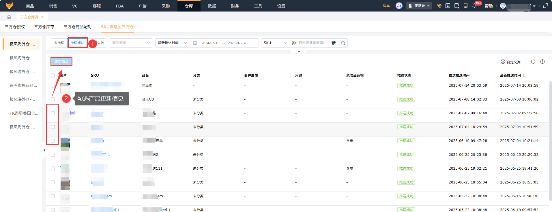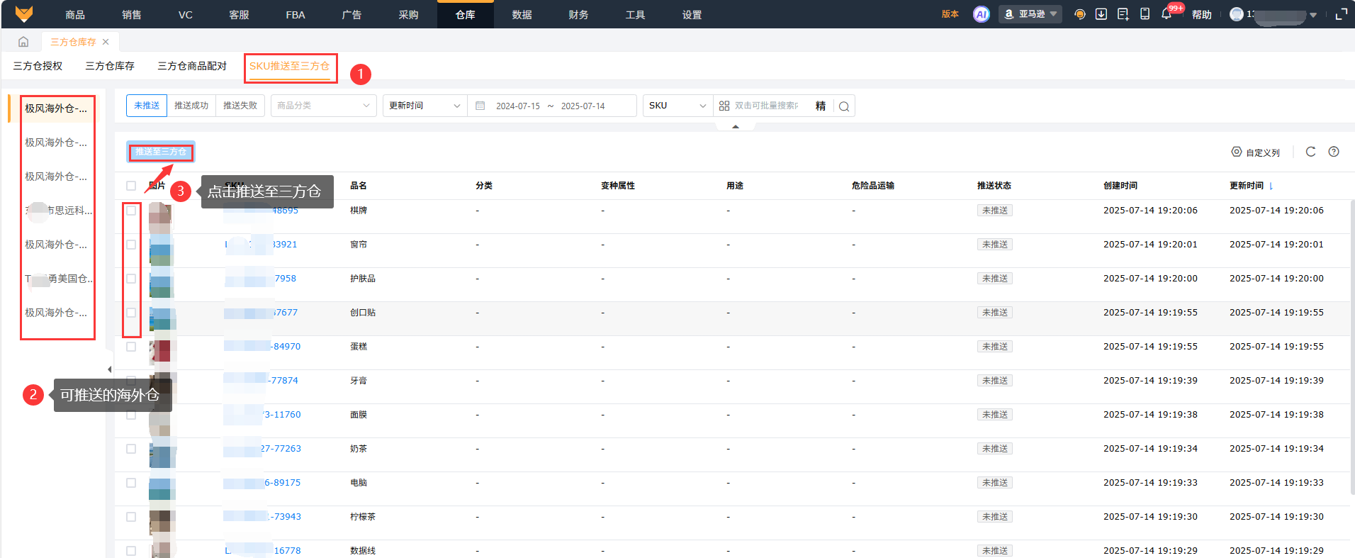 选择可推送的海外仓,勾选本地SKU点击【推送至三方仓】按钮推送。