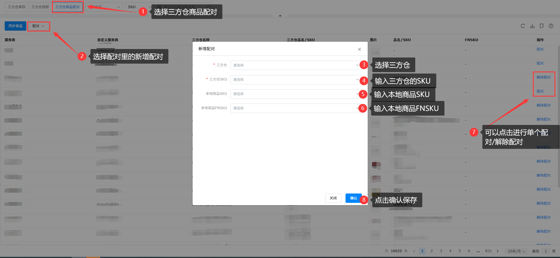在【三方仓商品配对】点击【新增配对】,填写需要配对的三方仓、三方仓SKU以及对应的本地商品SKU、本地商品FNSKU