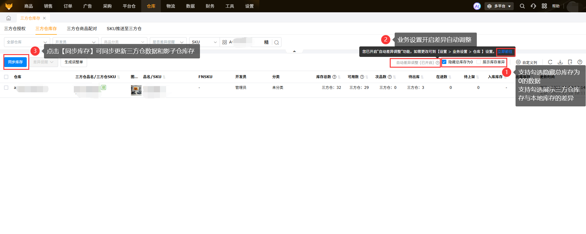 还需要注意的是,一配多的产品在三方仓库存中是不显示差异量的,系统统一归为“-”;并且不支持设置自动差异调整和设置差异提醒,要补充映射的本地仓的库存数量可以用调整单进行调整