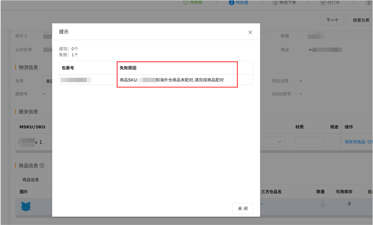 ,提示失败原因为商品和海外仓商品未配对的情况,需要到【三方仓商品配对】操作配对。