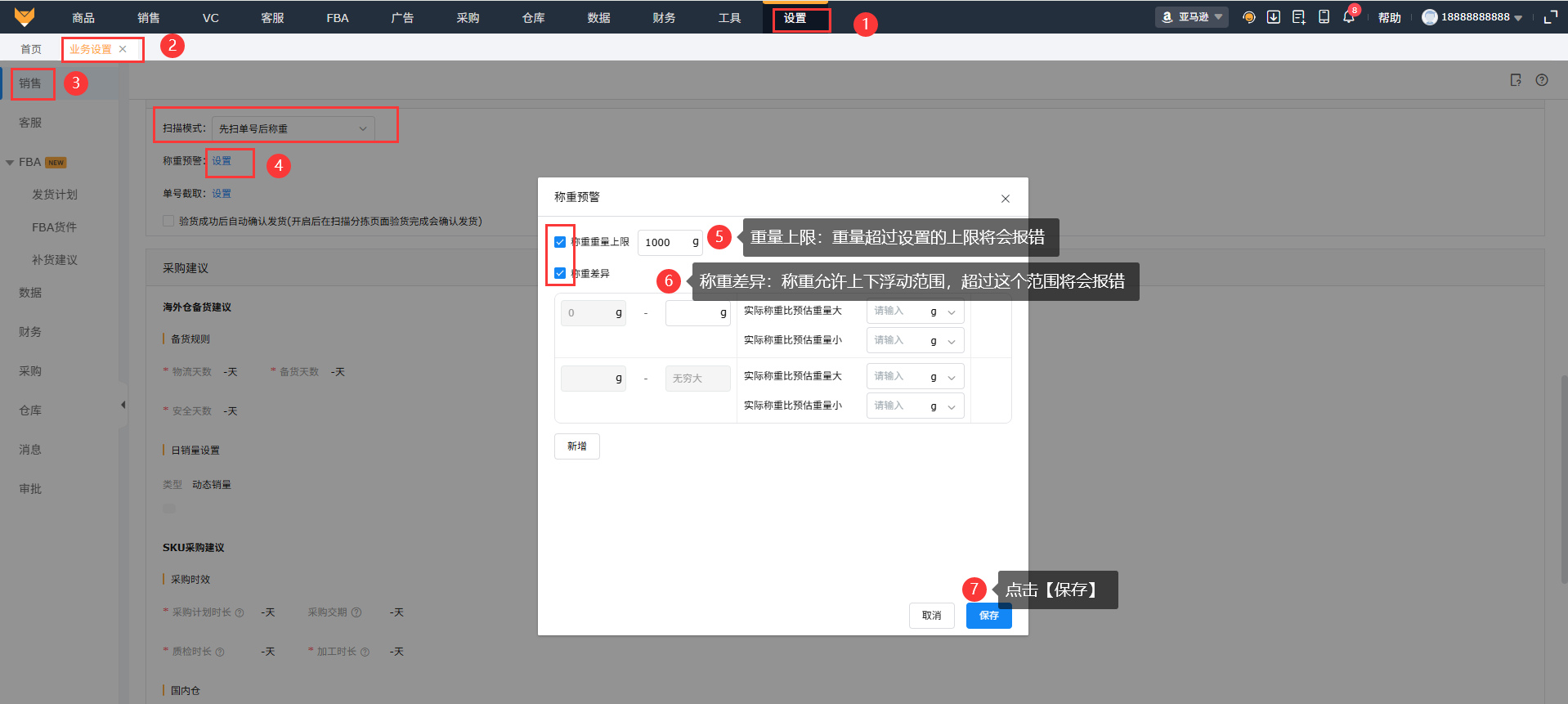 称重差异:设置允许上下浮动范围,超过此返回的将会报错;