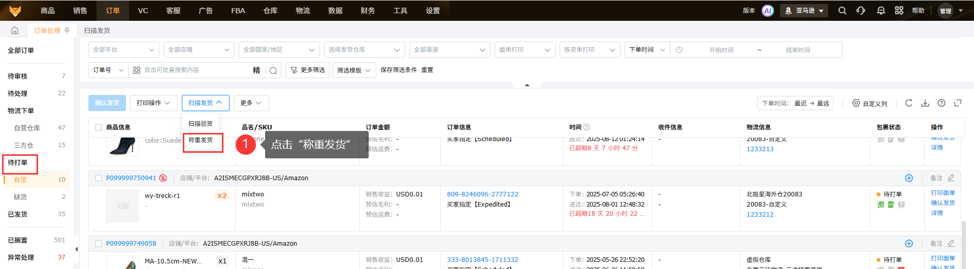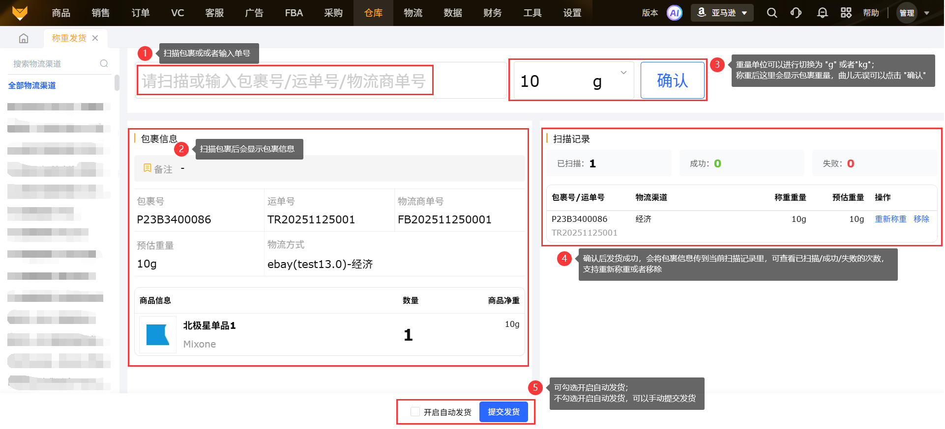 操作步骤:扫描发货→称重发货→扫描包裹→称重后确认
