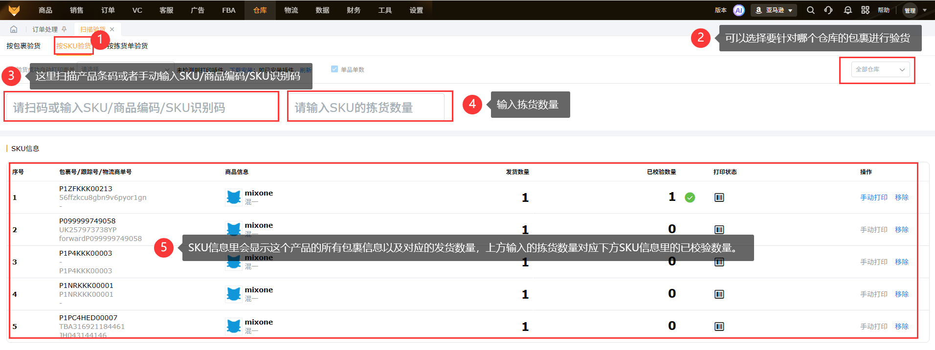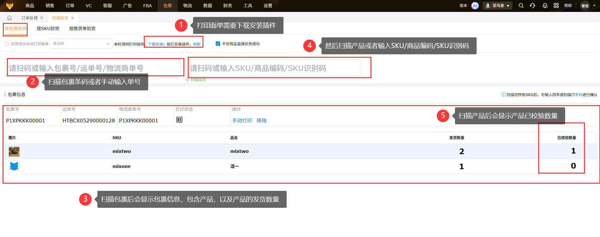 扫描分拣分为按包裹验货、按SKU验货、按拣货单验货,使用前需要下载安装插件;