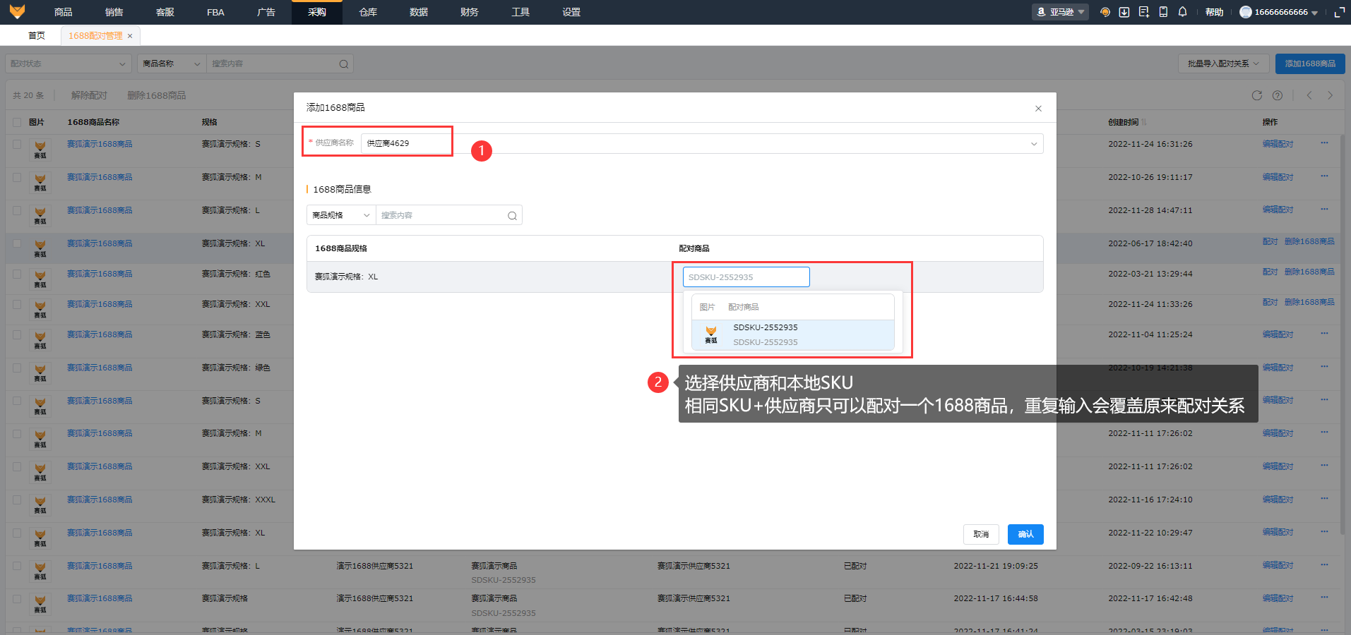 ②点击配对,则需要填写供应商名称和本地商品SKU,相同的SKU+供应商只可以对应一个1688商品。