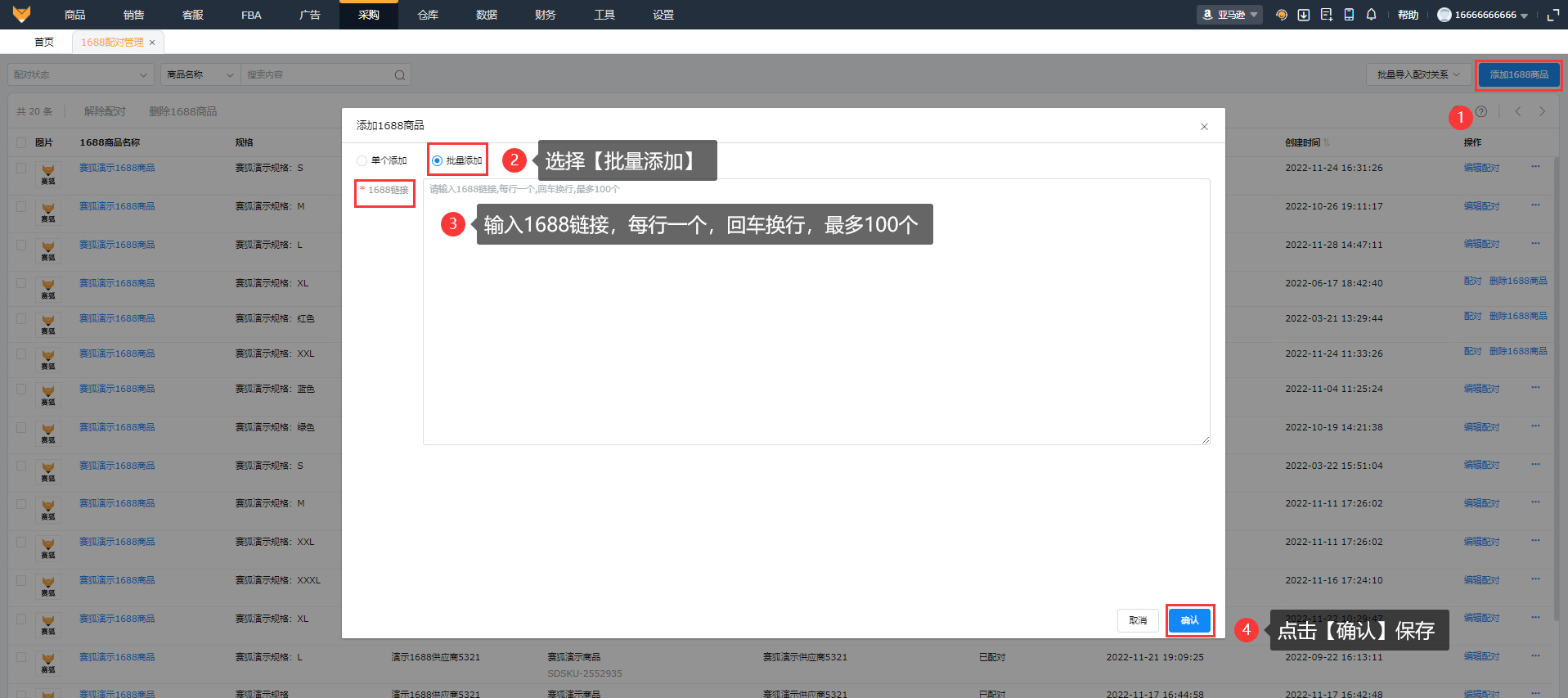 (1)支持单个1688商品的添加和批量添加。点击【添加1688商品】,如果选择单个添加,填写供应商名称和商品链接后,点击同步按钮,会把该链接下所有的1688商品全部展示;如果选择批量添加,最多添加100个。
