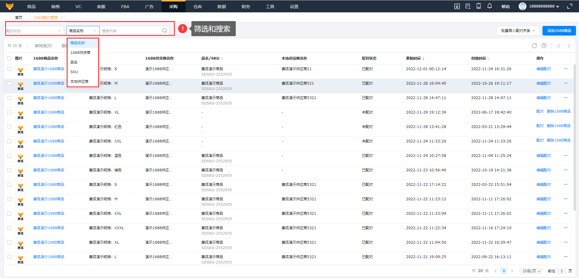 支持筛选配对状态和搜索商品列表数据;