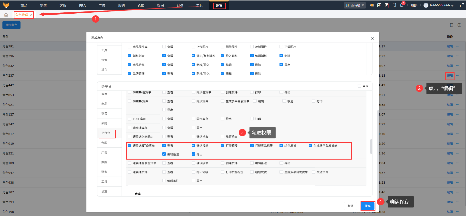 到【设置】-【角色管理】中找到子账号的角色,点击“编辑”,勾选上【平台仓】-【速卖通JIT备货单】的权限,点击保存。