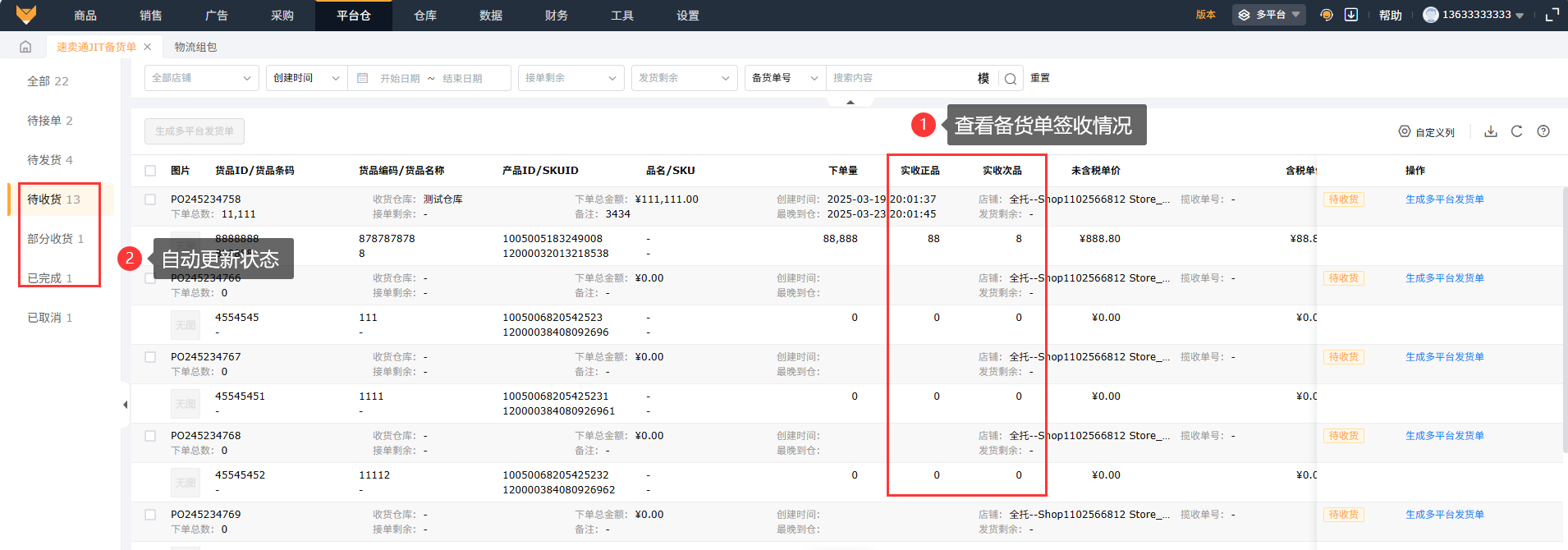 备货单完成组包发货后,后续系统备货单会自动更新平台签收的商品实收正品和实收次品的数量情况,并自动更新状态到对应【待收货】、【部分收货】、【已完成】等状态。