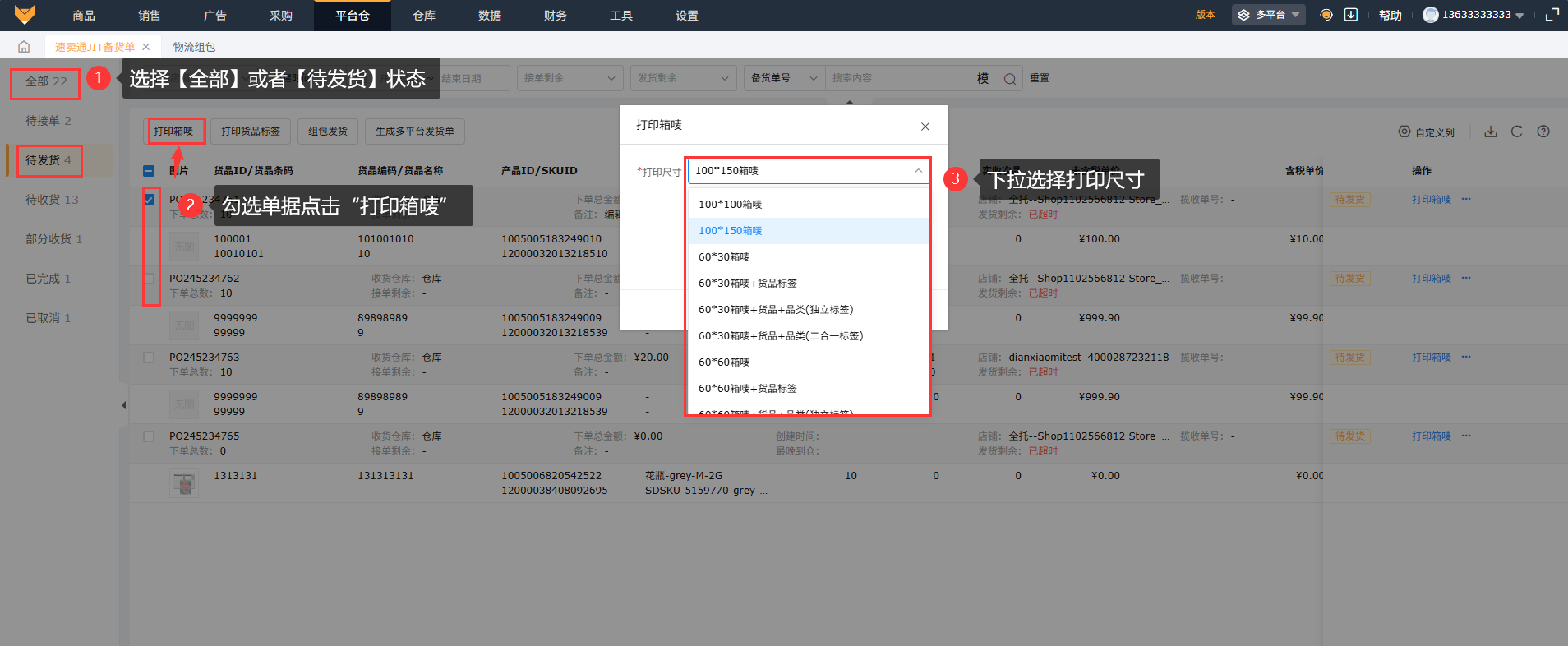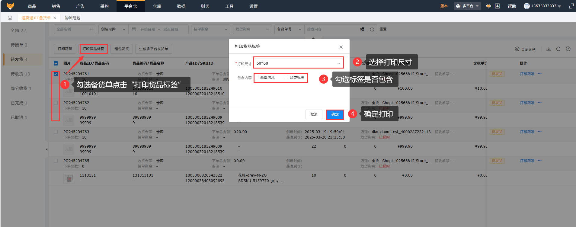 在【全部】和【待发货】状态下,可以勾选单据点击打印箱唛和货品标签,打印支持批量勾选备货单操作打印,也可以单个备货单操作打印,打印操作时系统可以同步速卖通返回的标签模板信息,可以选择不同模板尺寸打印箱唛和标签