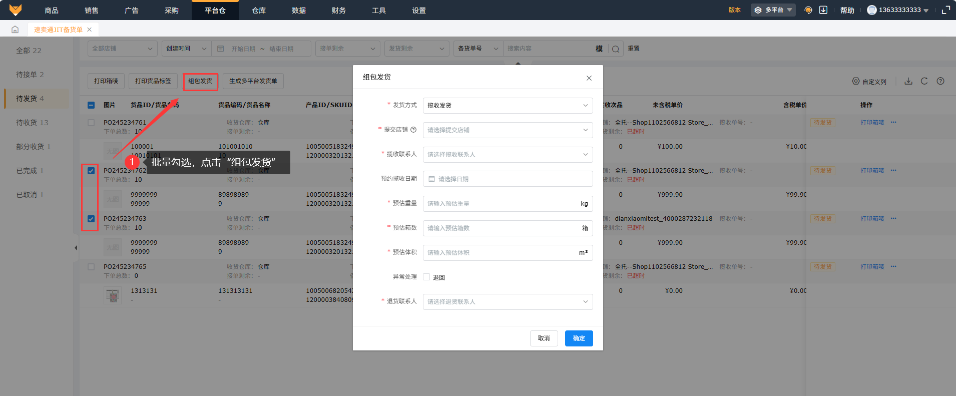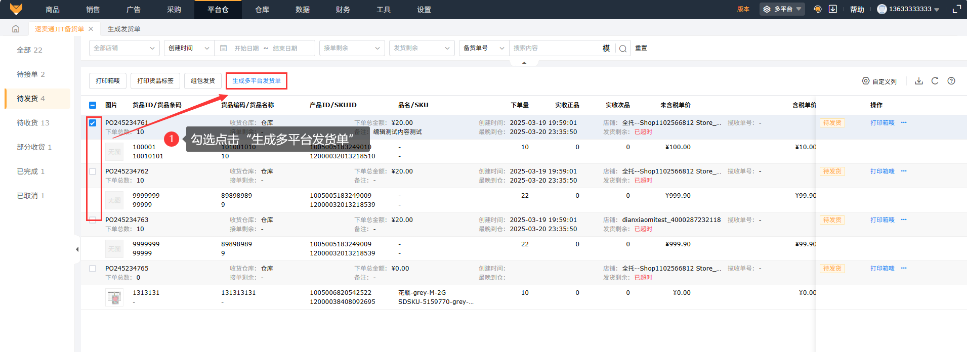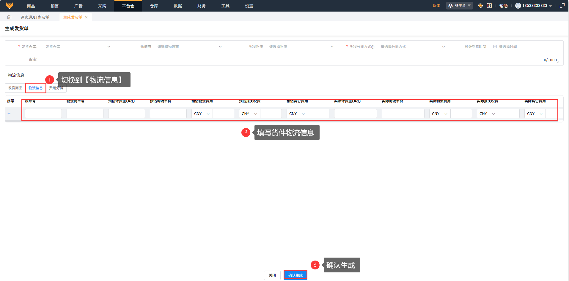 勾选货件,点击【生成发货单】,在创建发货单的页面中,选择好发货仓,填写商品的采购单价和物流费用信息,确认生成。