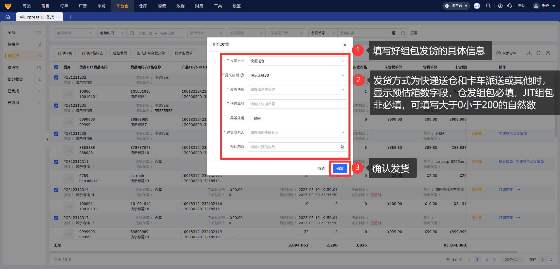 在【待发货】状态下,可以操作备货单的组包发货,页面可以操作单个备货单的组包发货,也可以批量勾选备货单操作组包发货,在组包发货的详情页面中,可以填写发货的具体信息,在发货方式中可以下拉选择揽收发货、快递送仓和卡车派送或其他,可以根据自己的发货情况选择发货方式,其中提交店铺的设置,如果跨店铺组包时需要选择某一个店铺提交组包,若发货方式为揽收发货,则所选店铺为揽收费用扣除的店铺;其他必填信息根据不同的发货方式填写好后,点击确定完成组包发货,备货单状态更新到【待收货】的状态,创建好的组包信息可以到系统的【销售】-【物流组包】中查看数据和操作打印揽收单/自送单面单。