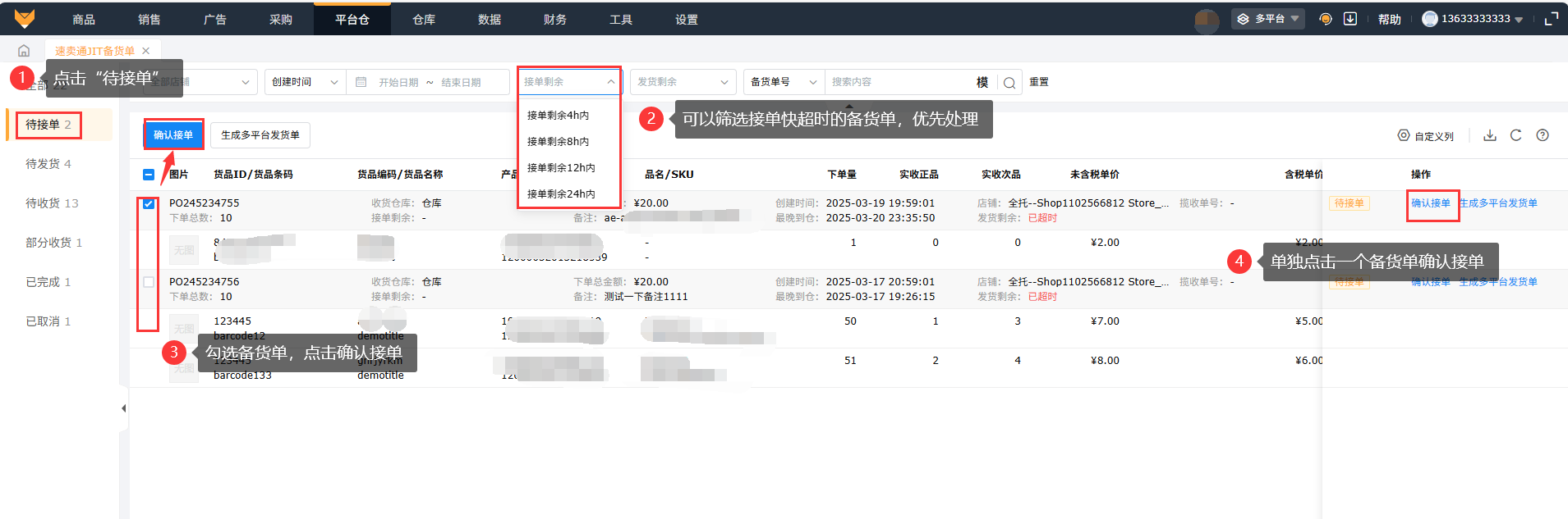 3.1 确认接单在【待接单】状态下,可以操作备货单确认接单,页面支持批量勾选备货单一起“确认接单”,也可以备货单的操作列中,点击“确认接单”单独操作某个备货单,如果列表页面数据较多也可以下拉接单剩余,筛选快超时接单的备货单,优先处理确认接单;操作“确认接单”后,在弹窗页面中点击“确定”完成接单;接单成功后,备货单状态更新为【待发货】,如果接单失败,会弹窗报错具体失败原因。