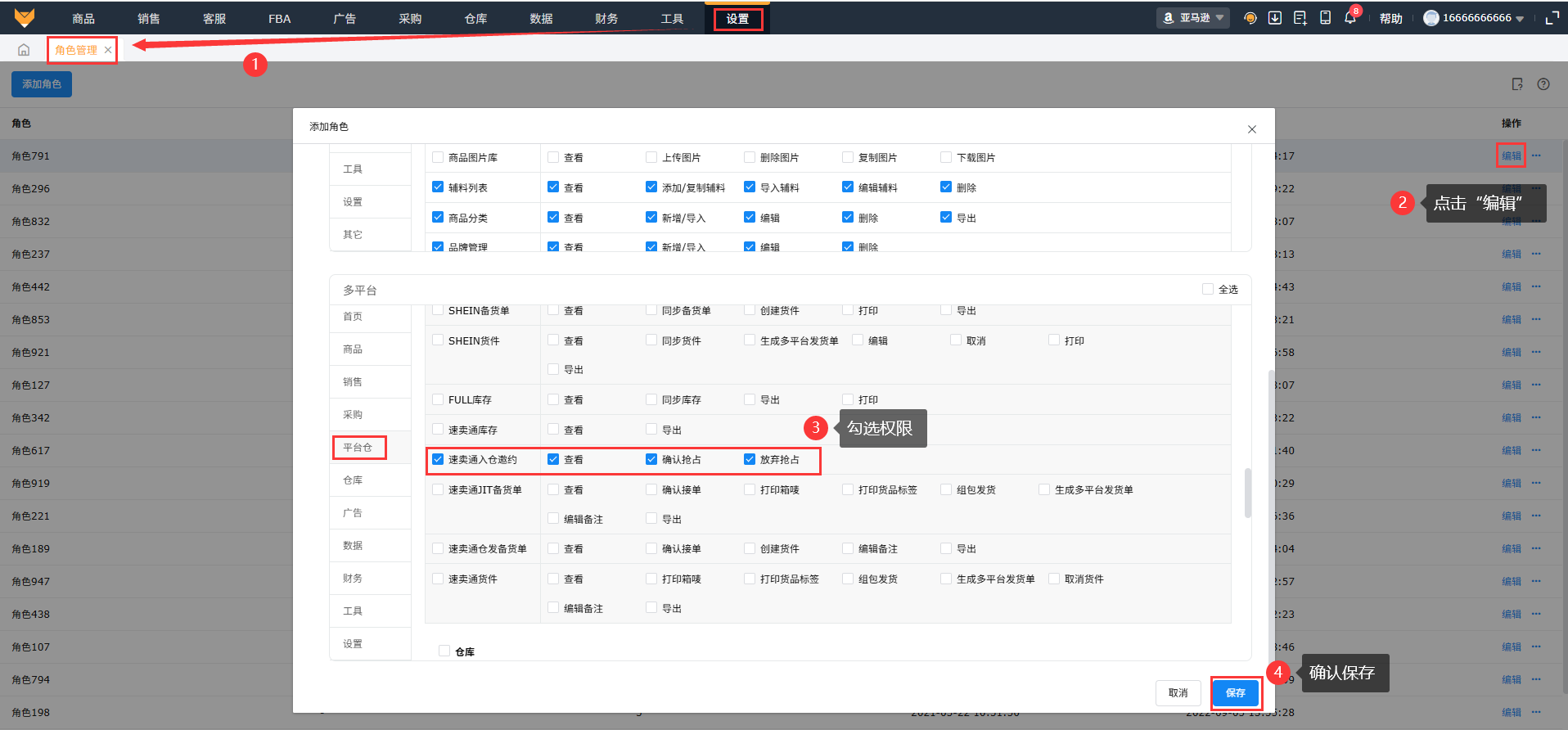 可以到【设置】-【角色管理】中找到子账号的角色,点击"编辑",将【平台仓-速卖通入仓邀约】权限勾选上,保存设置。