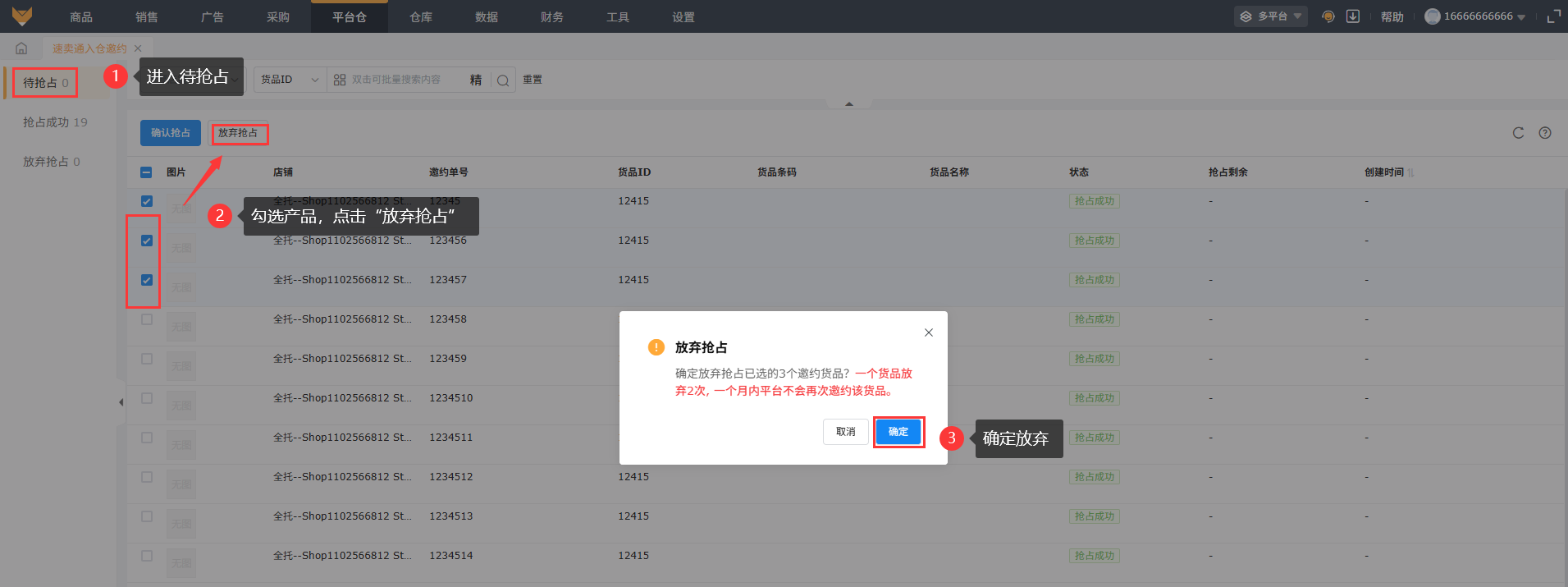 在待抢占状态下,针对不需要抢占入仓的产品,可以勾选产品点击“放弃抢占”,如果一个货品放弃2次入仓邀约的,最近1个月内平台不会再发起邀约该货品,确认放弃,点击“确定”完成放弃抢占的操作;放弃抢占成功后,邀约单状态更新为放弃抢占,如果失败,页面会弹窗报错具体原因,可以根据报错原因调整再操作“放弃抢占”。