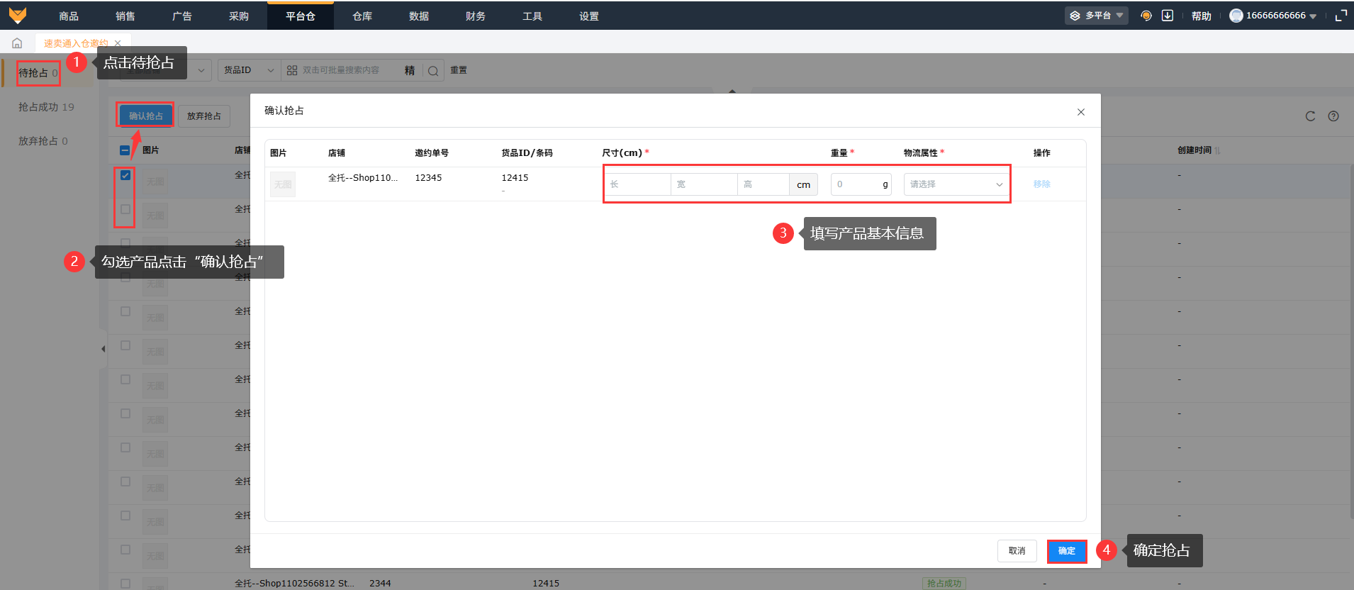 3.1 确认抢占在待抢占状态下,可以勾选产品点击“确认抢占”,在抢占页面中,填写产品具体的尺寸、重量、物流属性的信息后,确定抢占;抢占成功后,邀约单的状态更新到抢占成功,如果抢占失败,页面会有弹窗报错具体原因,列表页面邀约单的状态仍为待抢占,状态下面也会展示失败的具体原因,可以根据报错原因调整再操作“确认抢占”。