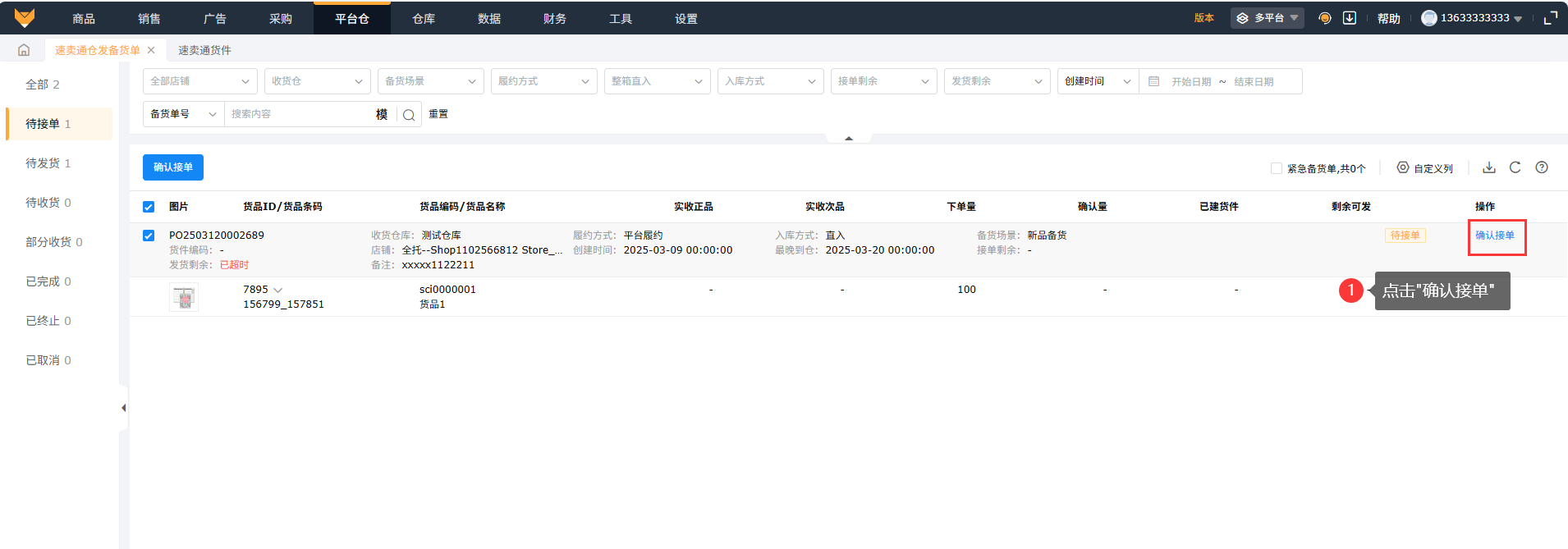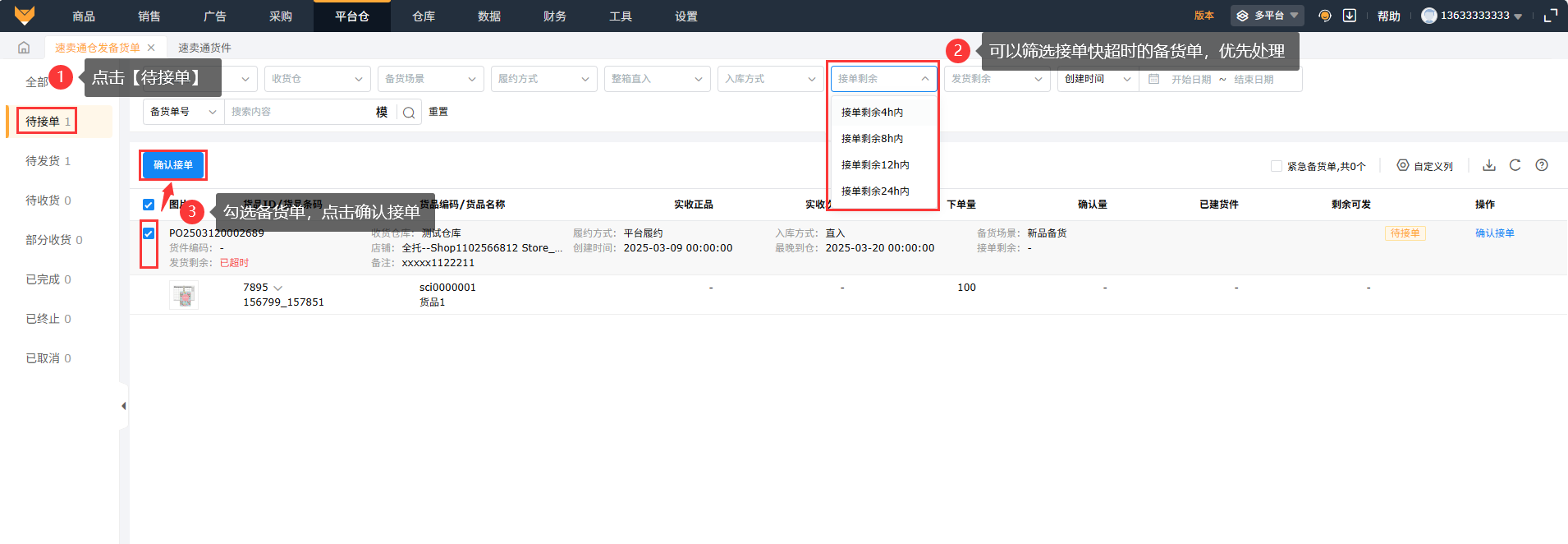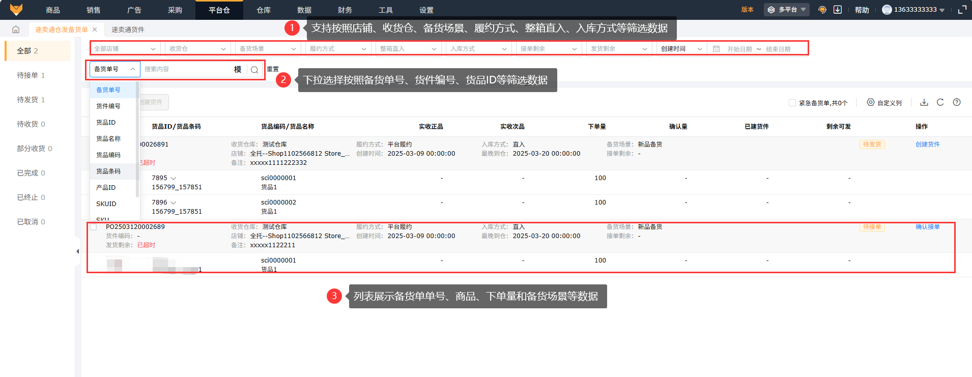 在多平台模式下的【平台仓】-【速卖通仓发备货单】进入页面,页面支持按照店铺、收货仓、备货场景、履约方式、整箱直入、入库方式、接单剩余时间、发货剩余时间、备货单号等产品信息筛选备货单数据,列表页面展示备货单中的产品、下单数量、入库方式、接单和发货剩余时间等数据