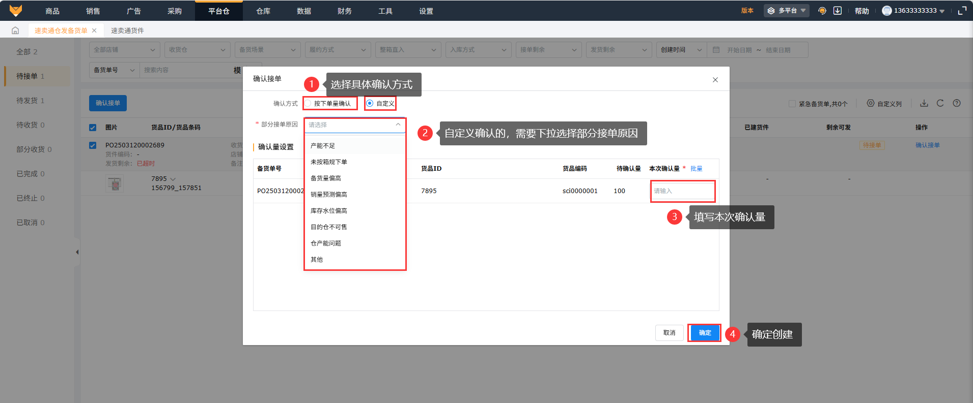 3.1 确认接单在【待接单】状态下,可以操作备货单确认接单,页面支持批量勾选备货单一起“确认接单”,也可以在备货单的操作列中,点击“确认接单”单独操作某个备货单,如果列表页面数据较多也可以下拉接单剩余,筛选快超时接单的备货单,优先处理确认接单;在 弹窗的确认接单的页面中,可以选择确认方式是“按下单量确认”或者是“自定义”,选择自定义后,可以下拉选择部分接单的具体原因,再填写本次确认量,点击确定完成接单,接单成功后,备货单的状态更新到【待发货】
