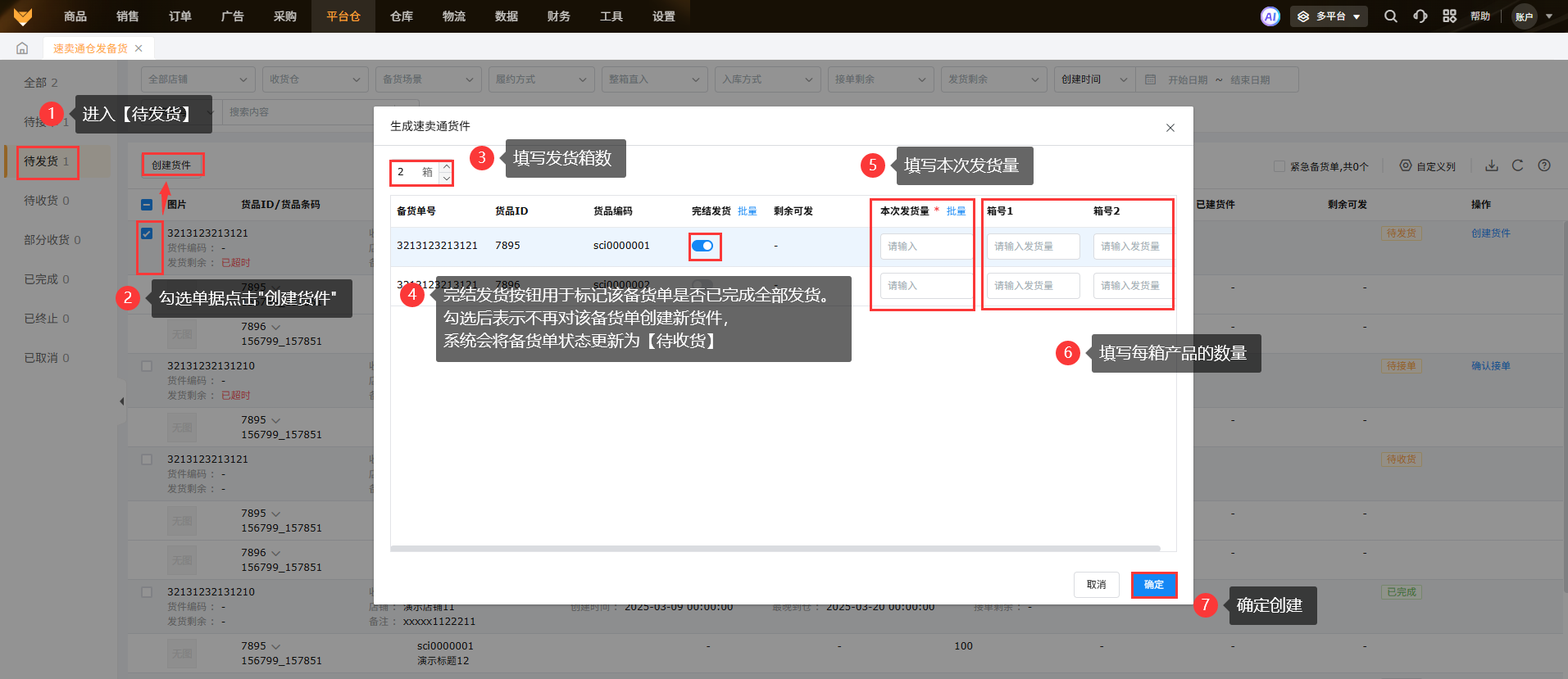 在【待发货】状态,可以勾选备货单点击“创建货件”,在弹窗的创建详情页中,可以填写发货具体箱数,对应产品本次发货量和每个箱子中产品的发货量;同一个备货单可以分多次创建货件,当创建货件发货量大于下单数据量后,备货单状态更新到【待收货】;创建好的货件可以到系统【平台仓】-【速卖通货件】操作组包发货