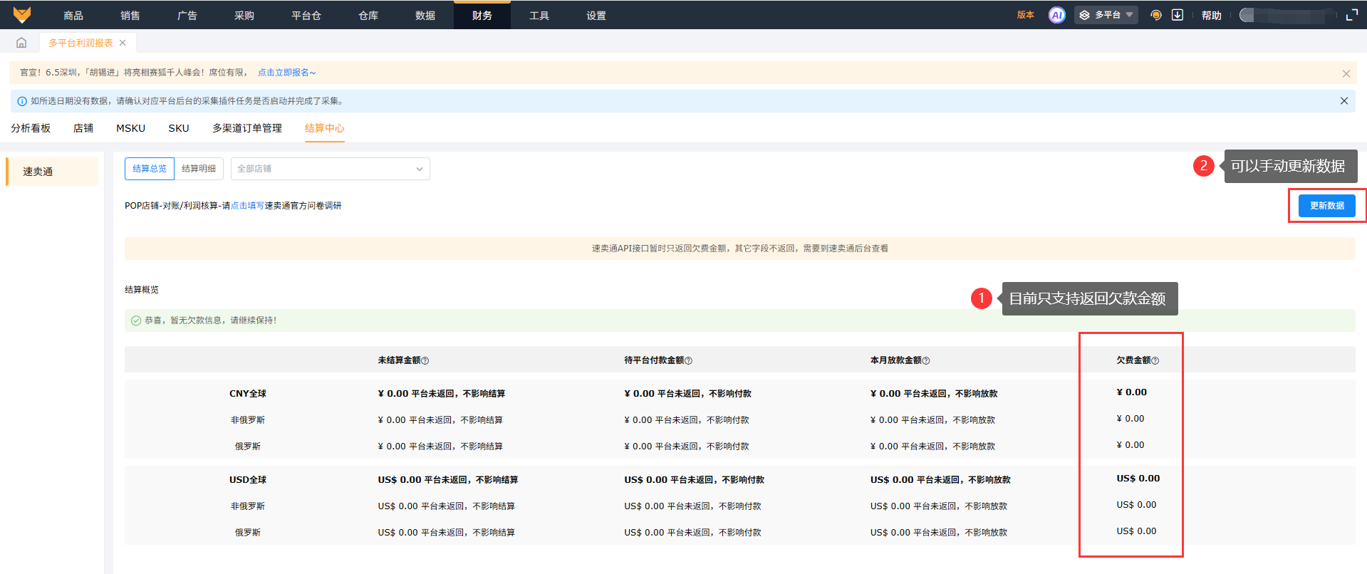 通过接口直接获取速卖通POP与POP半托管店铺的总览数据以及收入支出明细, 获取到的数据除了在多平台利润报表的结算中心展示,也能在多平台利润报表的店铺以及产品维度展示。