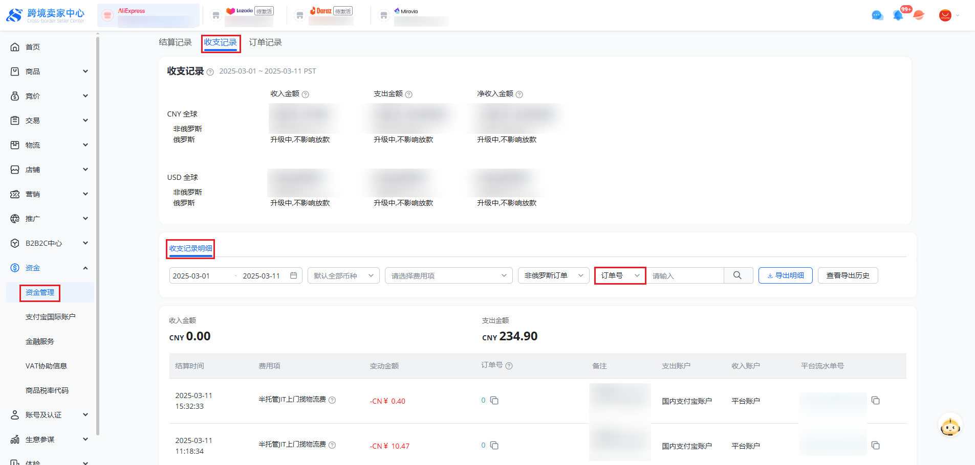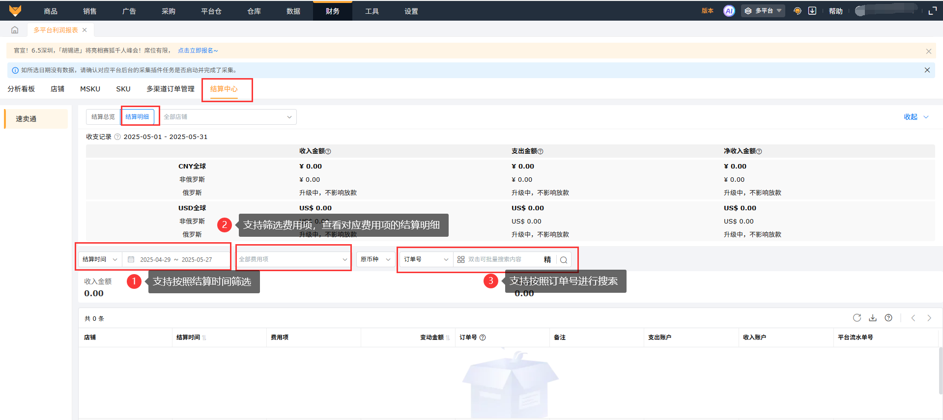 支持查看所有店铺的收支记录以及结算的明细数据。