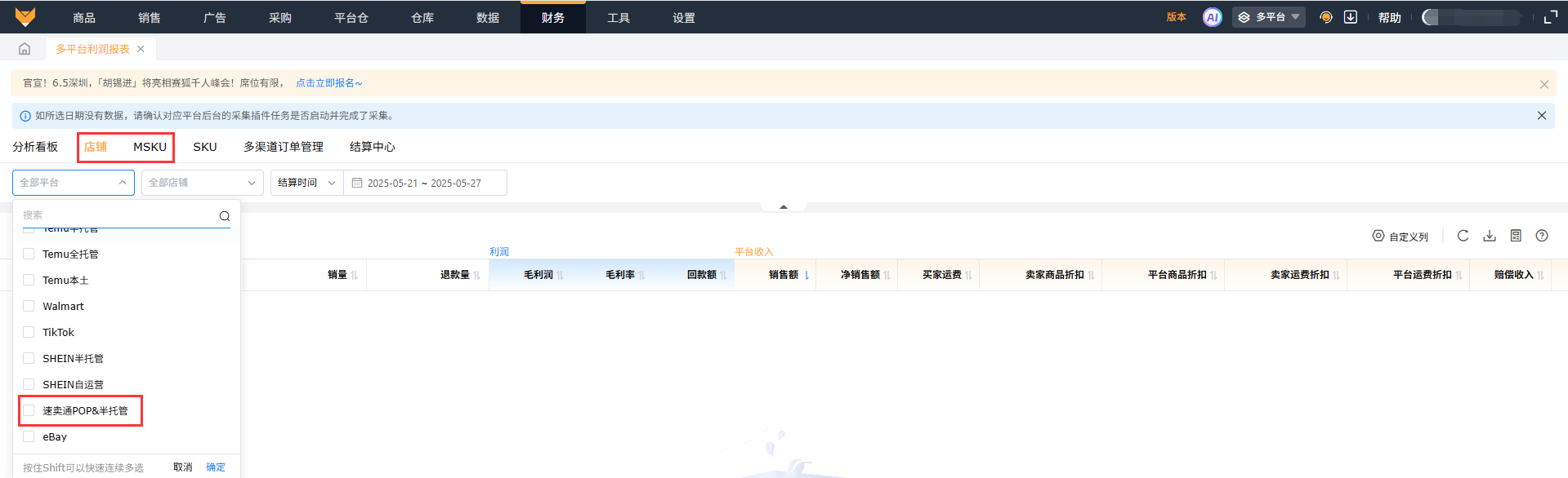 A2:在多平台利润报表的店铺和MSKU维度筛选速卖通平台即可查看。
