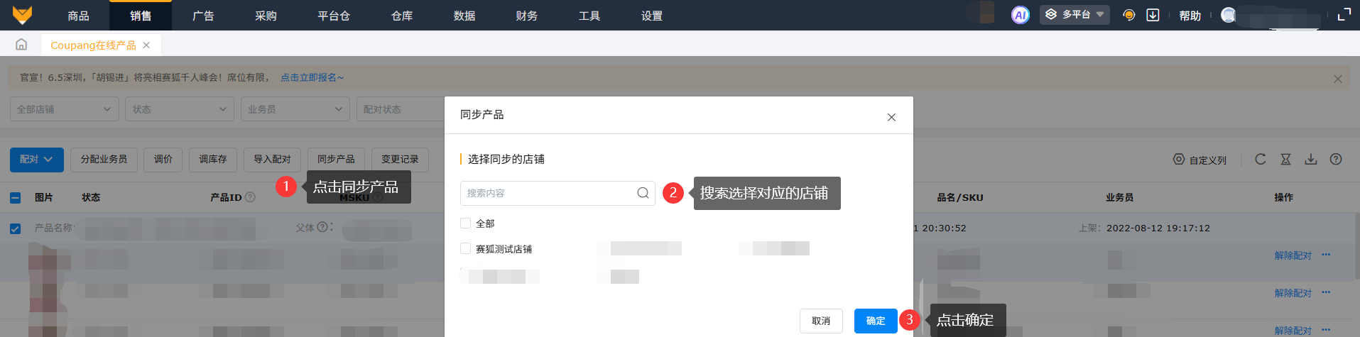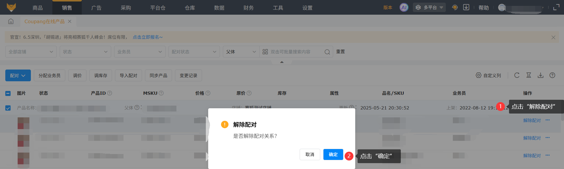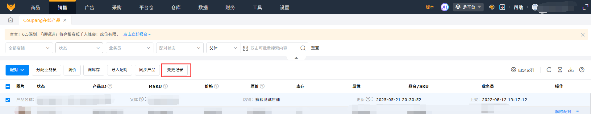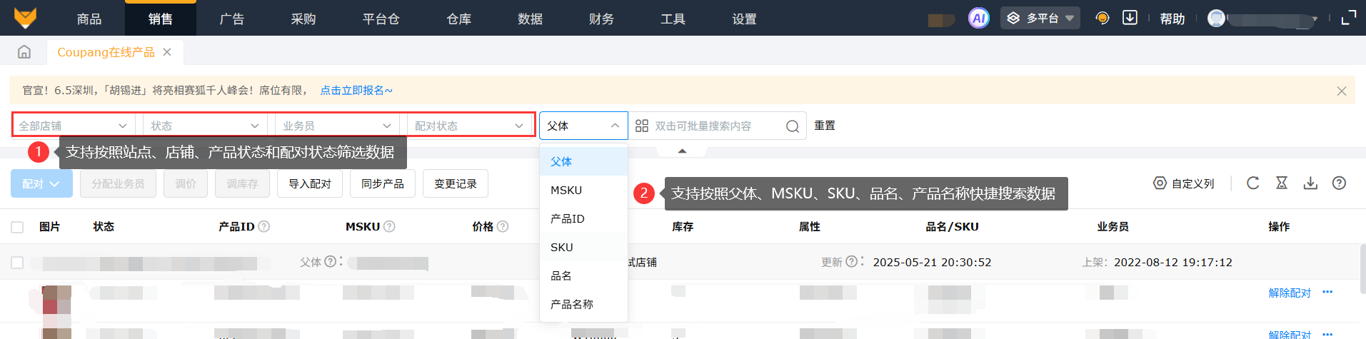 多平台模式下,进入【销售】-【Coupang在线产品】页面,支持按照站点、店铺、产品状态、配对状态和MSKU等快速筛选查看产品数据。