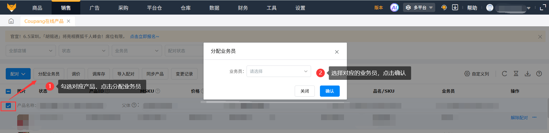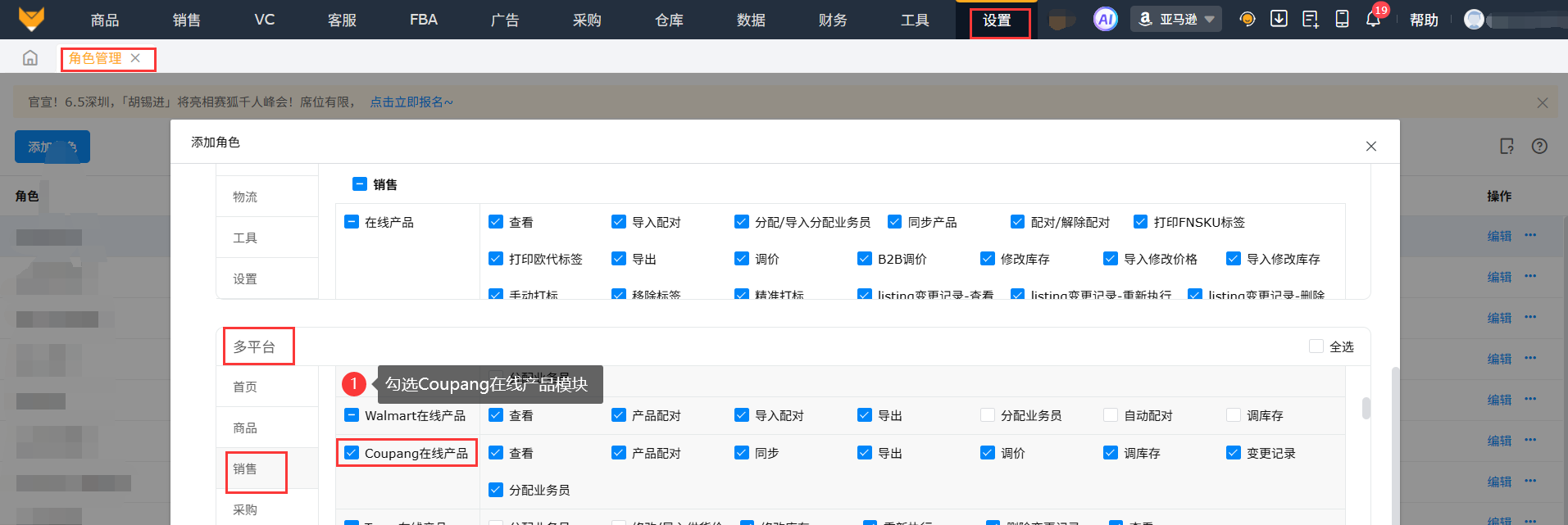 在亚马逊模式下,到【设置】-【角色管理】中找到子账号的角色,点击角色编辑,勾选上多平台-销售-Coupang在线产品的权限,保存设置。