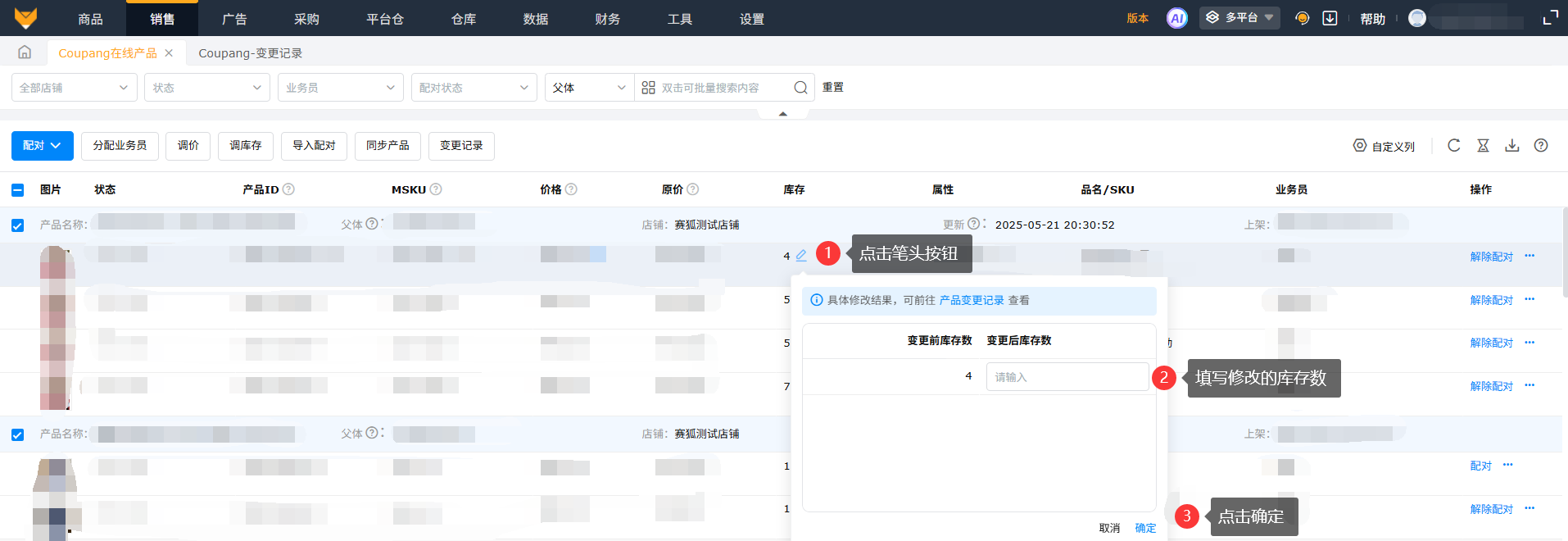 勾选需要修改库存的产品,点击库存数字,填写修改后的库存数,修改库存数填写的值必须大于0,确认保存调整。
