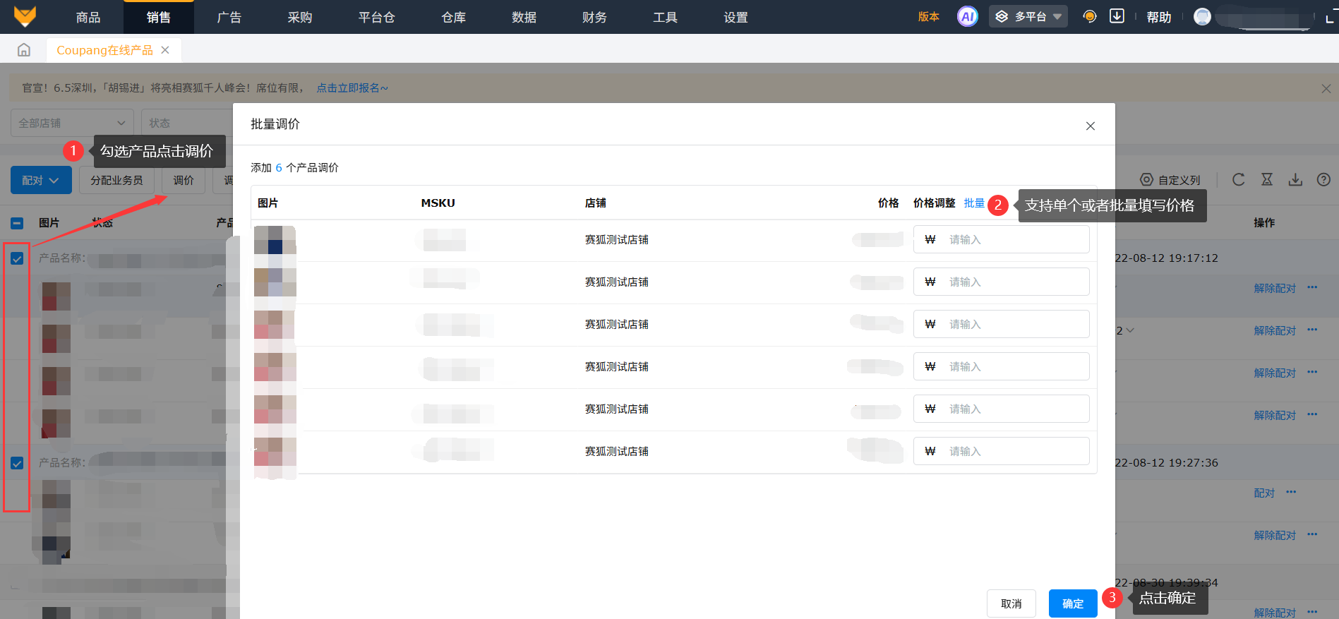 支持多选要修改的产品,点击“调价”,调价可以批量按照某个固定值直接调整,或者是在原来价格基础上加价或者减价多少。