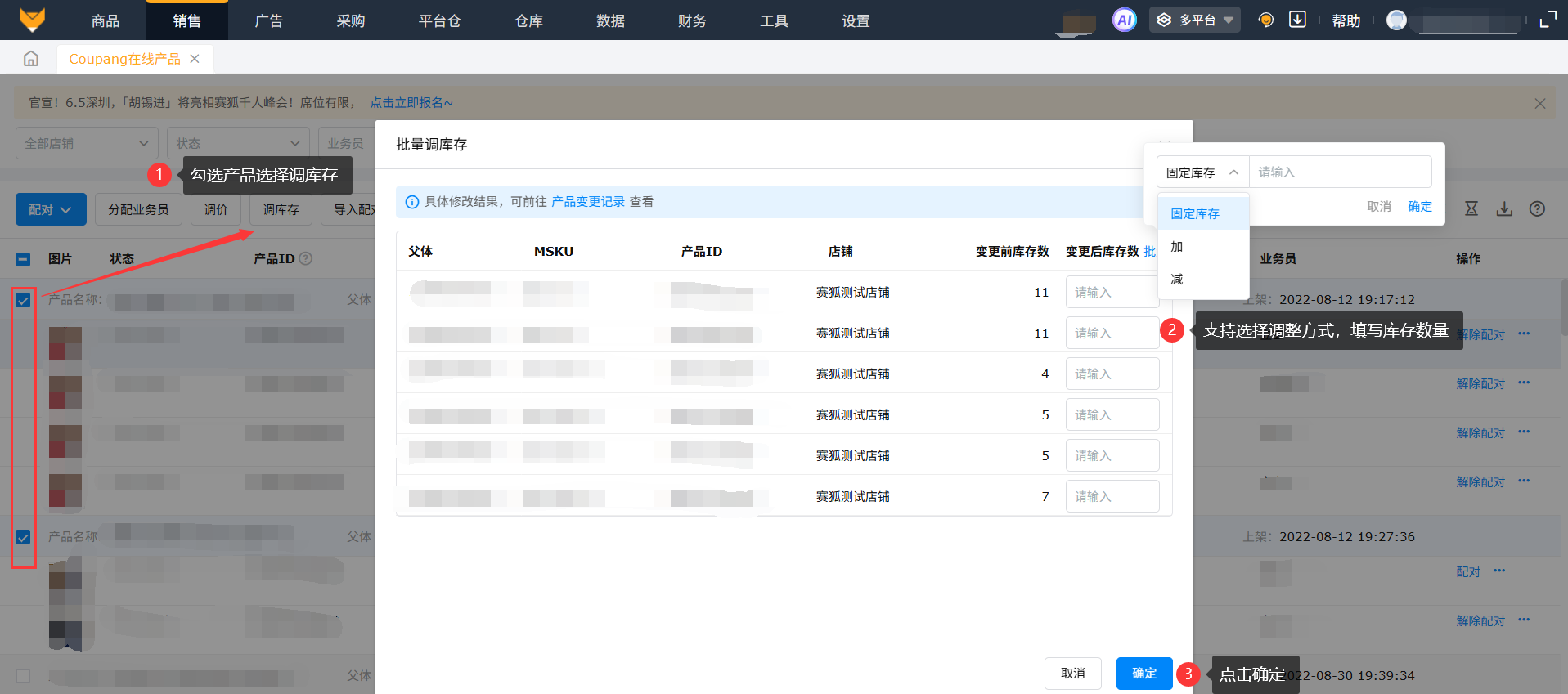 多选要修改的产品,点击“调库存”,调库存可以批量按照某个固定值直接调整,或者是在原来库存基础上加或者减多少。