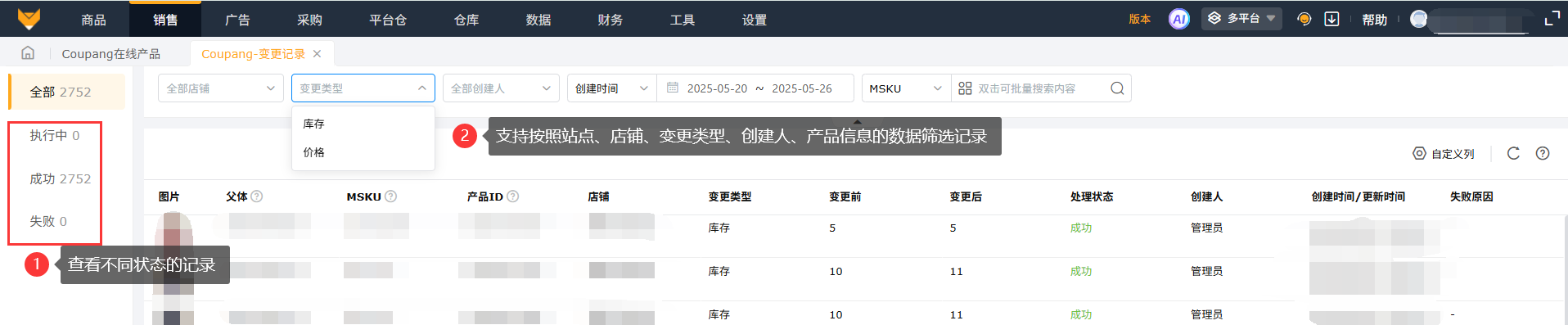 在变更记录中可以查看在系统操作修改产品的价格和库存的记录,可以查看执行中、执行成功和失败的任务状态,在页面支持按照站点、店铺、变更类型、创建人、任务创建时间和MSKU等条件筛选数据。