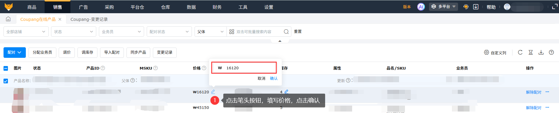 在系统完成授权Coupang店铺后,支持在【销售】-【Coupang在线产品】页面查看店铺产品信息,包括产品标题、MSKU、价格和库存等基本数据。