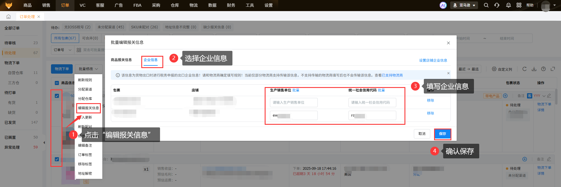 支持多选包裹,点击“批量修改”中的编辑报关信息,填写企业信息下单