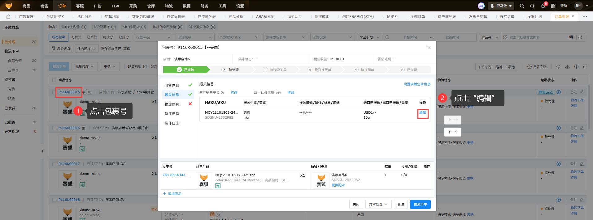 在【订单处理】中点击包裹号,到【报关信息】下点击“编辑”,填写好包裹的进出口申报价等报关信息,确认保存