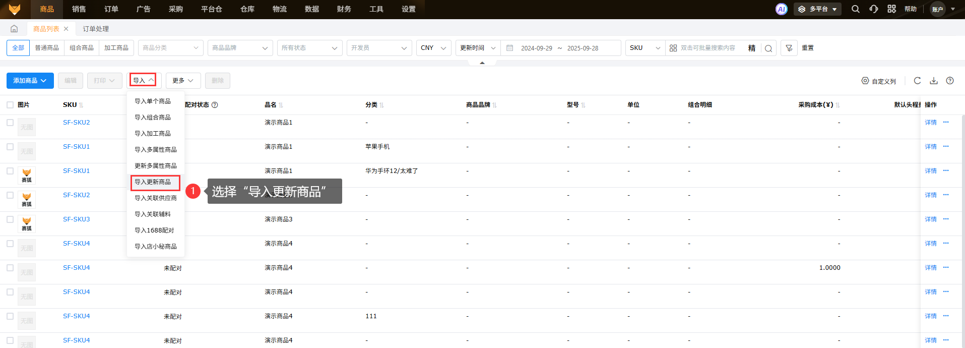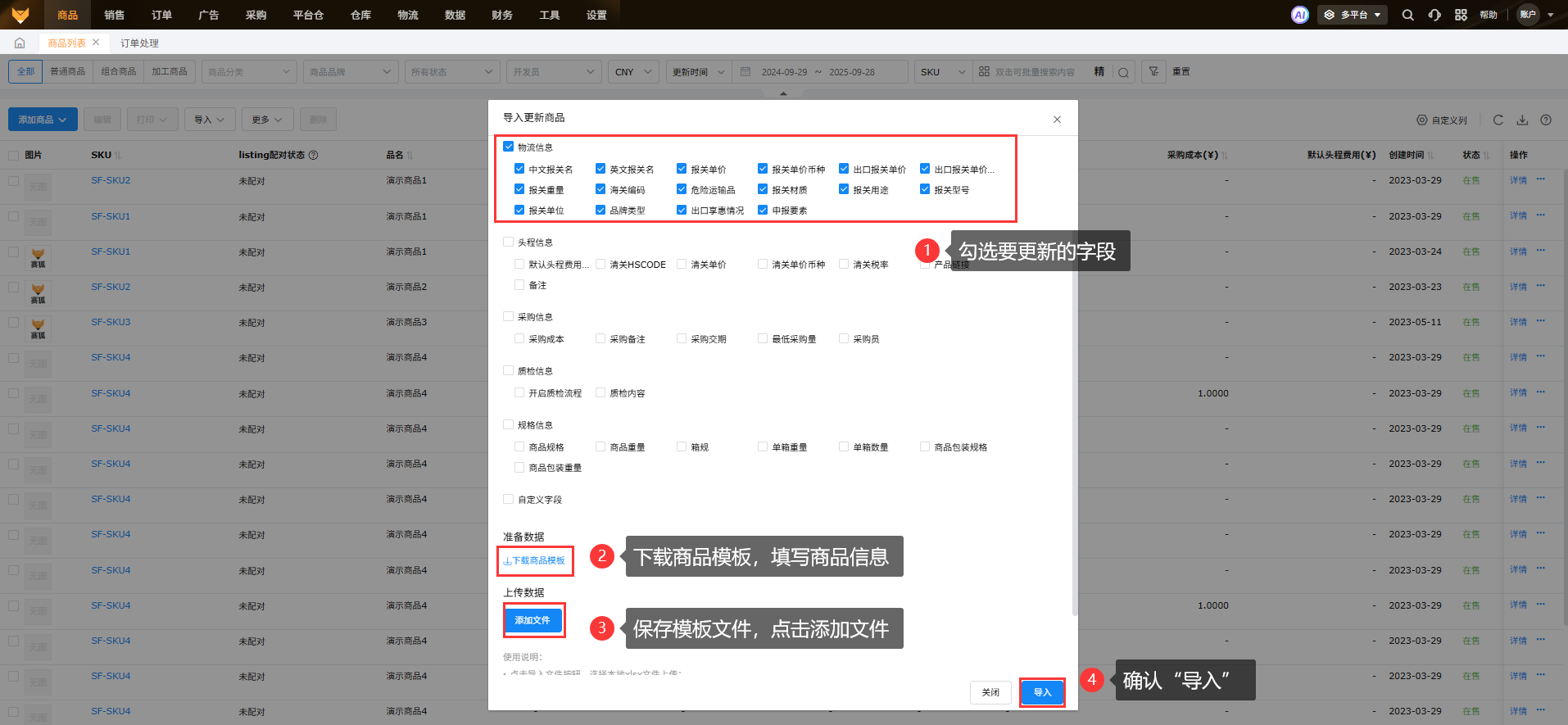 批量更新商品列表中SKU的报关信息,可以点击【导入】-【导入更新商品】,勾选报关信息中要更新的字段,导出模板文件,在模板文件中填写好要更新的SKU和报关信息,添加文件后导入更新