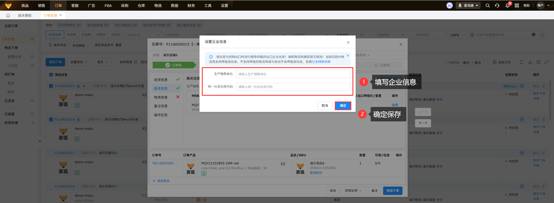 点击包裹号,在包裹详情的【报关信息】中点击“生产销售单位”旁边的编辑按钮,设置保存企业信息