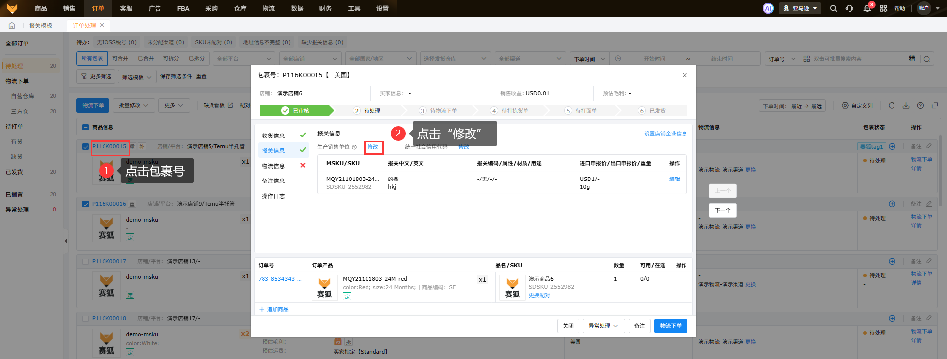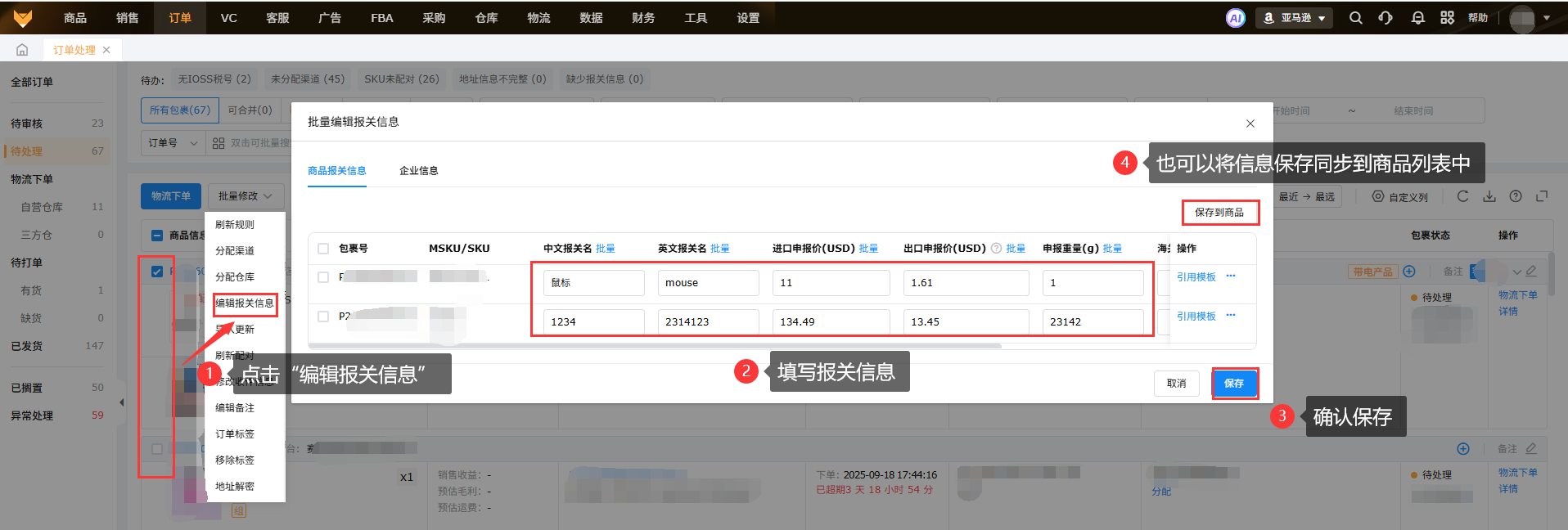 【订单处理】页面可以多选包裹,点击“批量修改”中的编辑报关信息修改