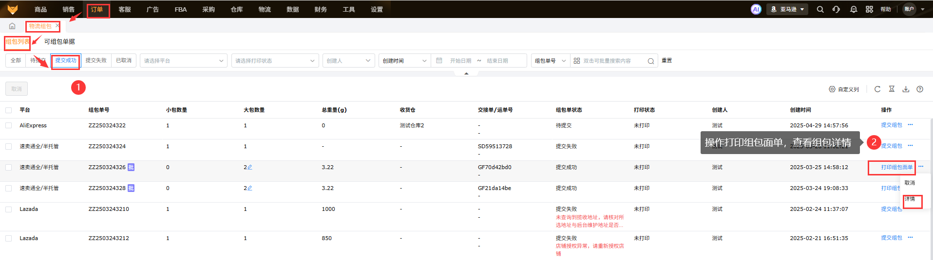 操作生成提货单后,在【订单】-【物流组包】中生成对应提货单的组包记录,如果有需要查看组包详情和操作打印面单的,可以到这边操作
