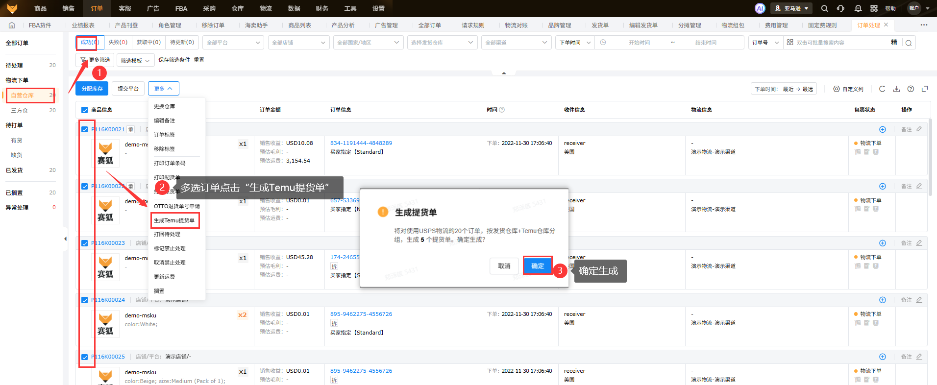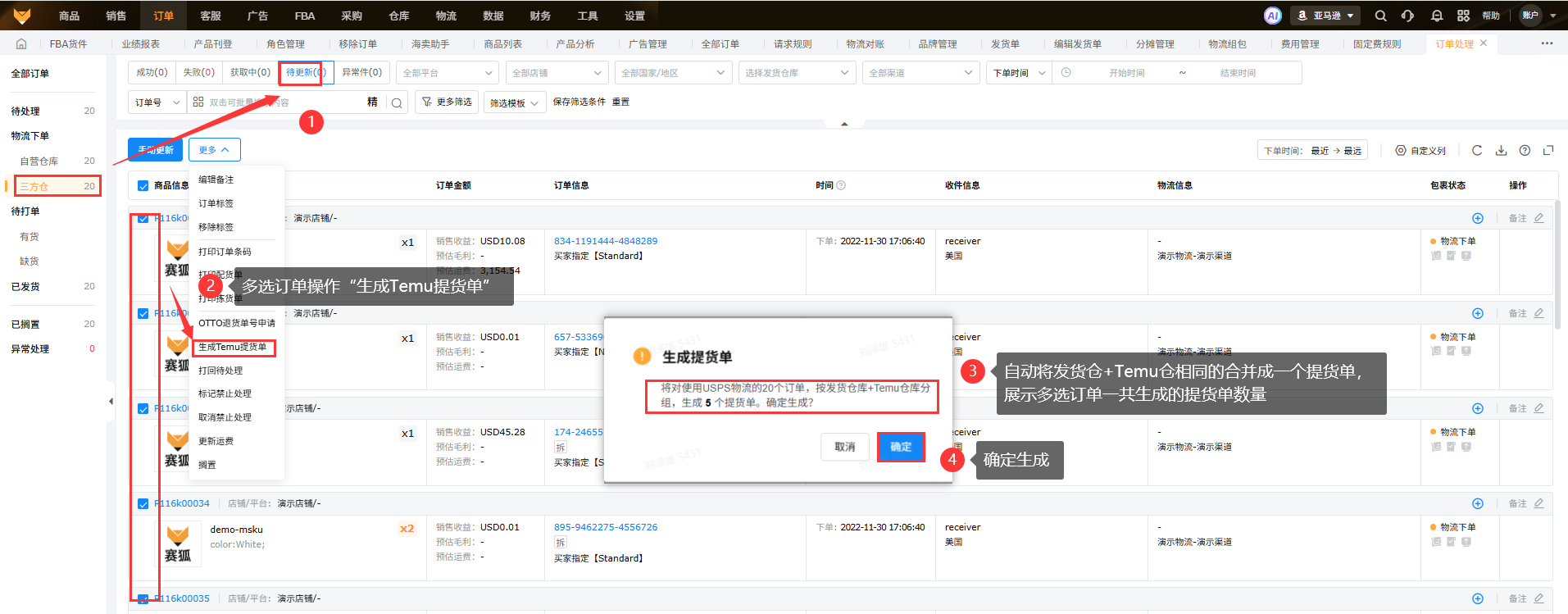 在【订单】-【订单处理】页面的【物流下单】-【三方仓】-【待更新】状态和【物流下单】-【自营仓】-【成功】状态下,支持点击“更多”中的“生成Temu提货单”对Temu平台且平台物流承运商是USPS且订单状态不是已取消的包裹生成提货单,系统会按发货仓+Temu仓库分组,相同发货仓+Temu仓的订单合并生成一个提货单,生成提货单后继续完成订单发货。