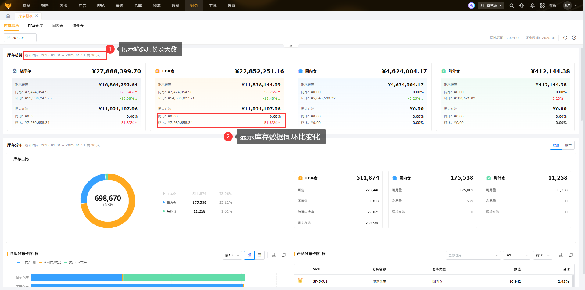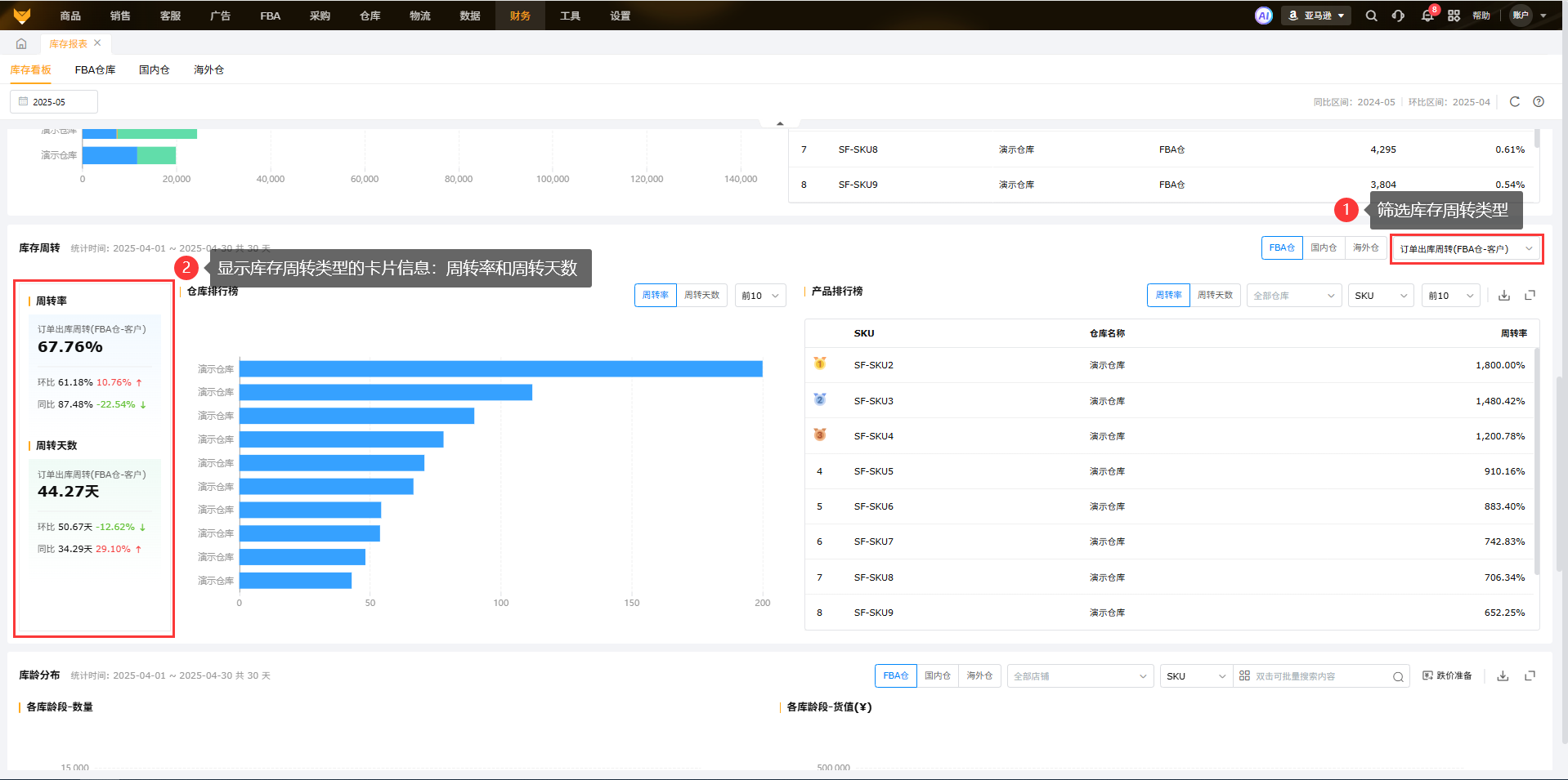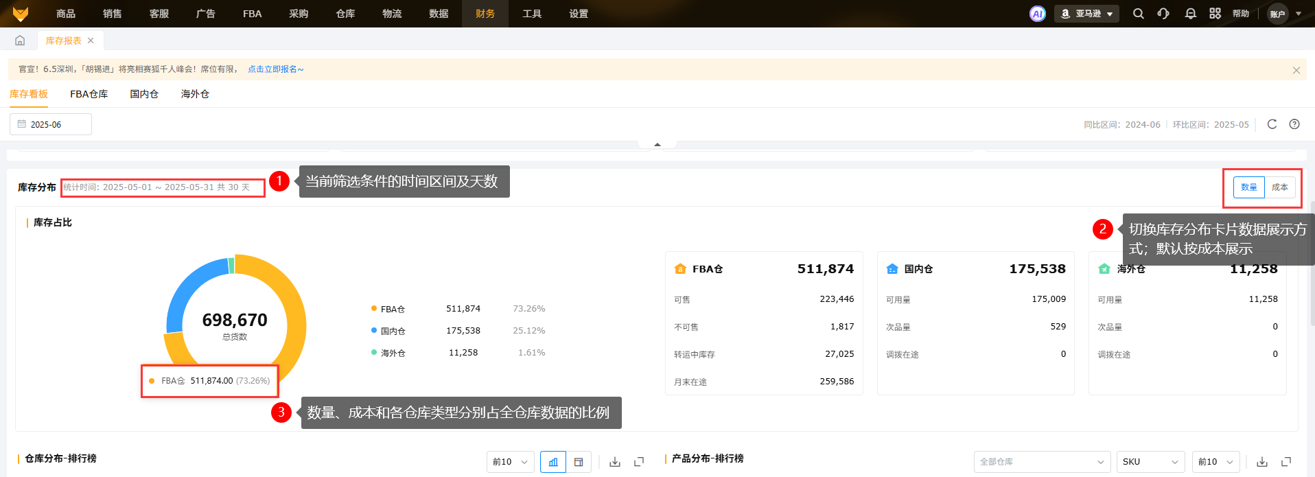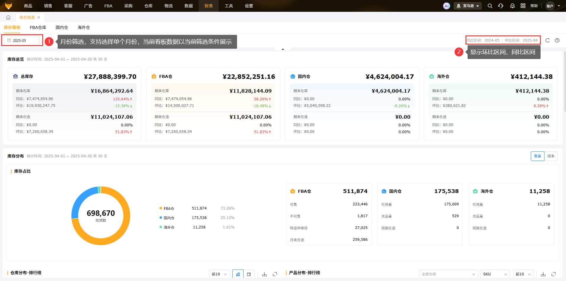 【财务】>【库存报表】>【库存看板】根据所选的月份,展示国内仓、海外仓和FBA仓的库存分布、库存周转、库龄分布的信息。