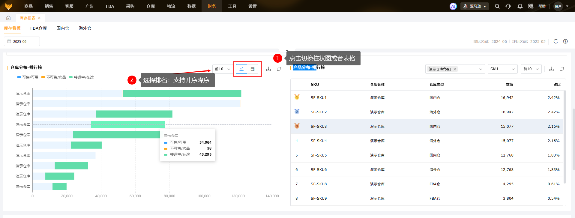 2.2 仓库分布排行榜提供了柱状图和表格的方式,以及切换排序如前10、前20或者后10、后20,个性化查看数据。