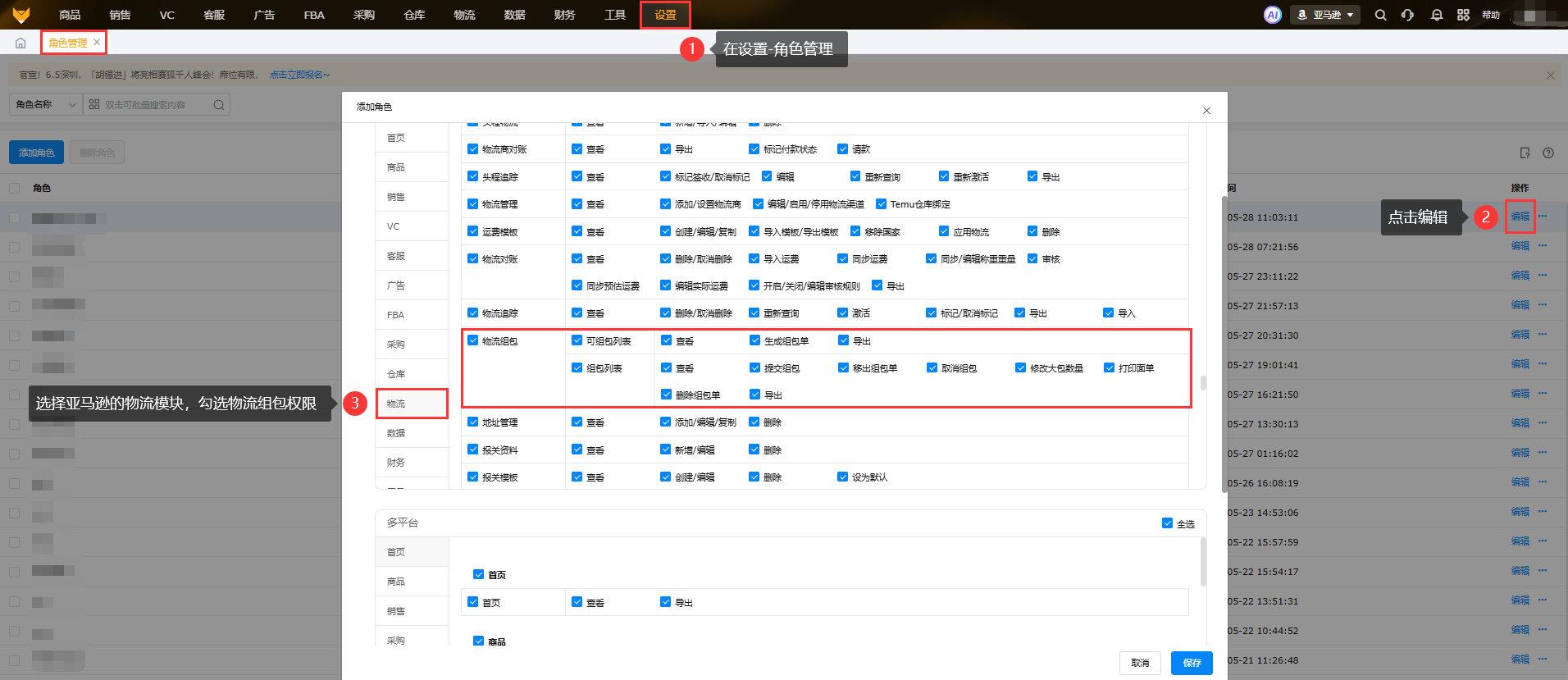 赛狐主账号和超级管理员都有物流组包的权限,子账号则需要权限授予,在 设置-角色管理 页面中编辑角色,选择亚马逊 物流-物流组包 权限进行勾选。