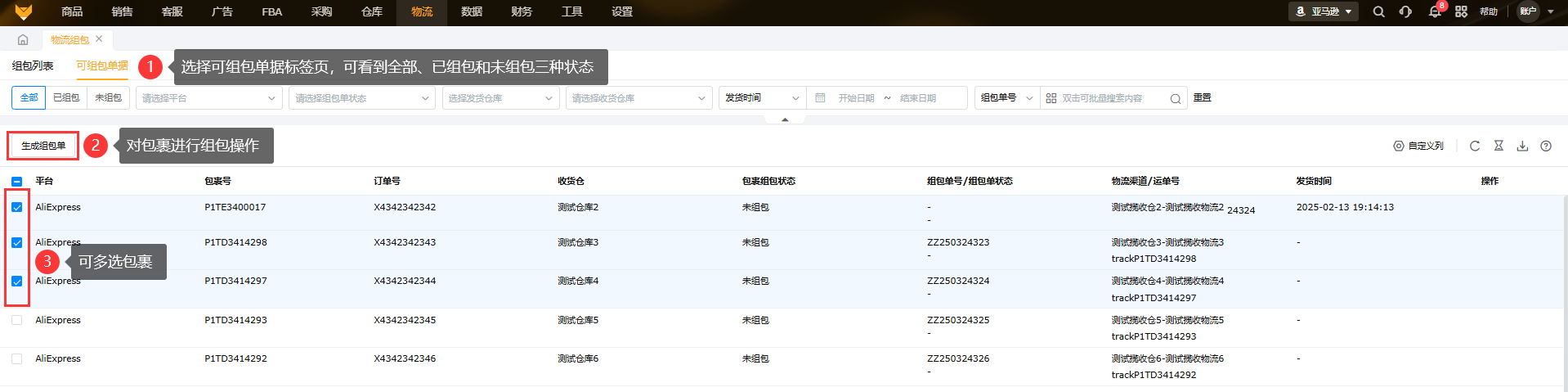 勾选同一个平台的包裹,并且组包的包裹的发货仓库和收货仓库要相同(注意:是指包裹与包裹之间的发货仓库和收货仓库相同,例如1号包裹的发货仓库是A,收货仓库是B,那么2号包裹想要一起组包那包裹的发货仓库也必须是A、收货仓库是B),然后选择生成组包单。