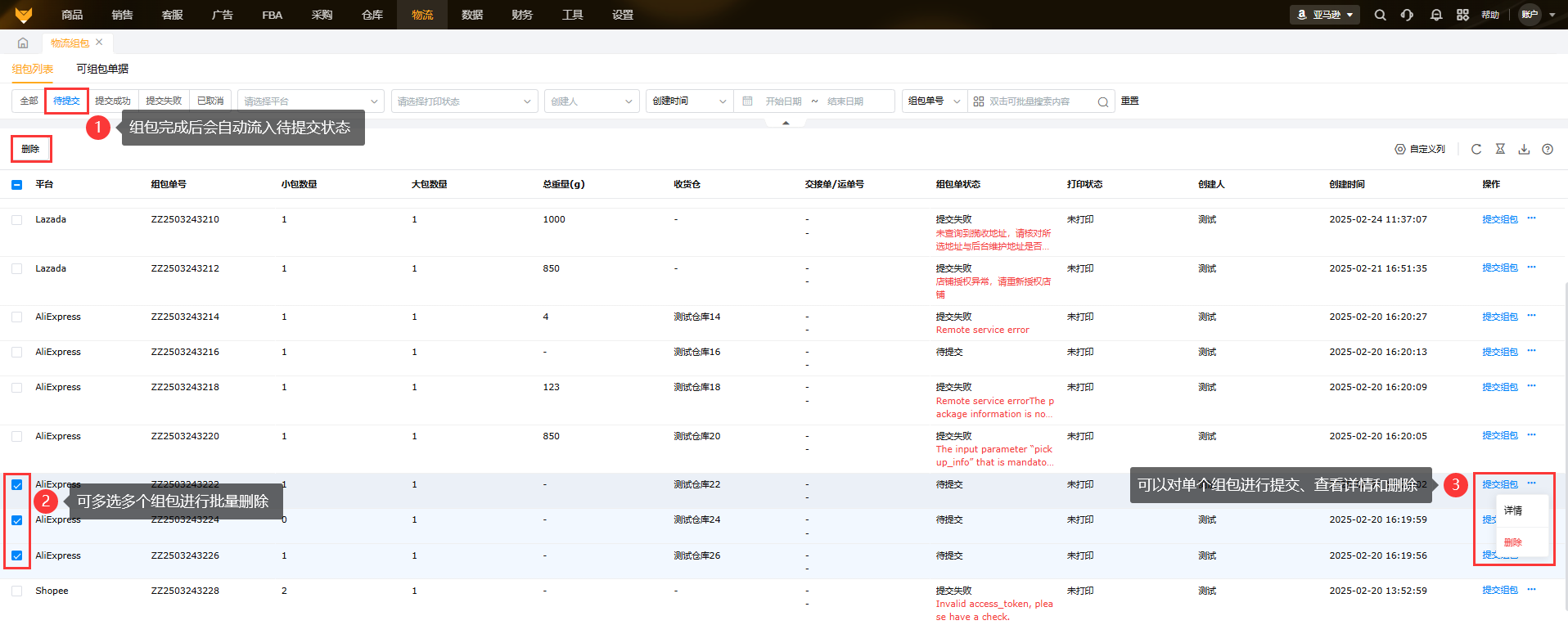 生成组包后系统组包会流入待提交,在此页面可以删除组包、提交组包和看组包详情。
