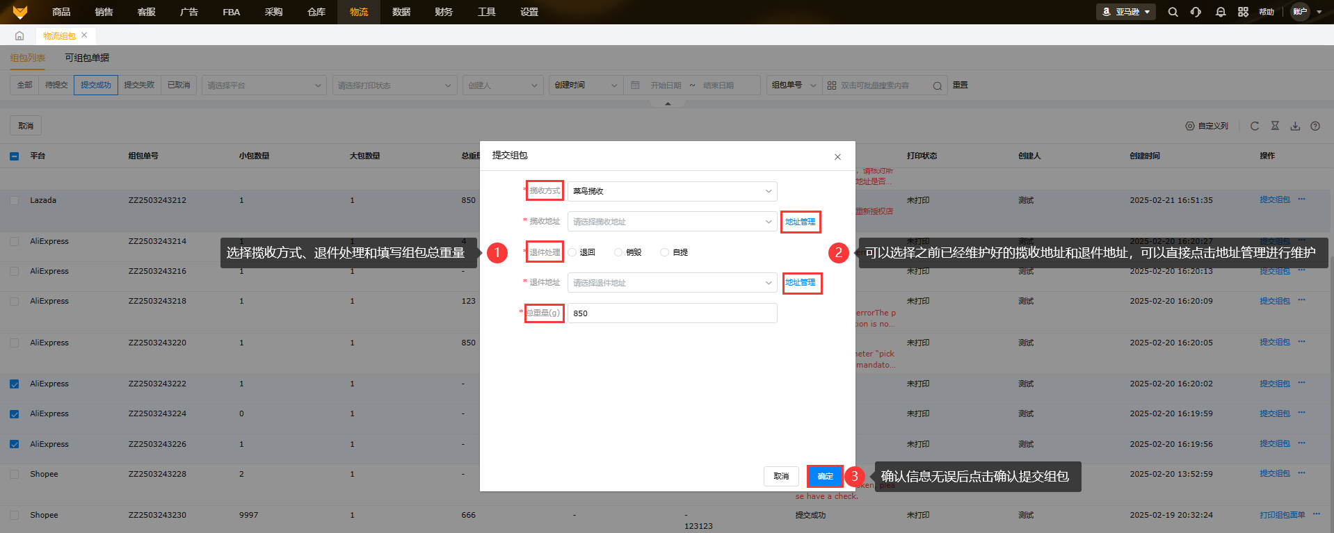 填写提交组包信息。