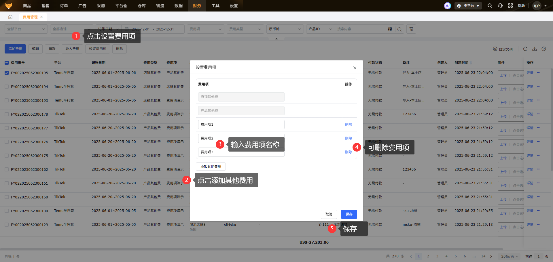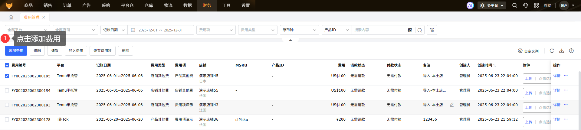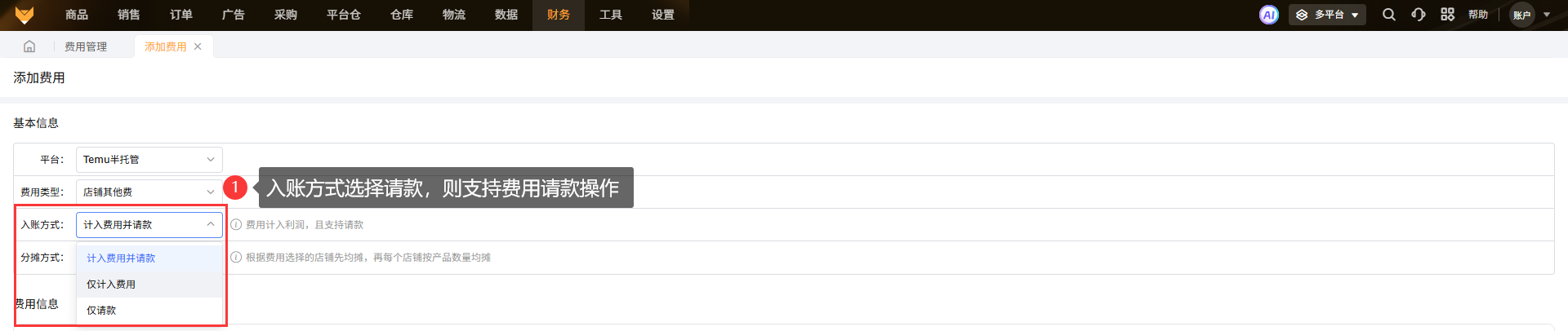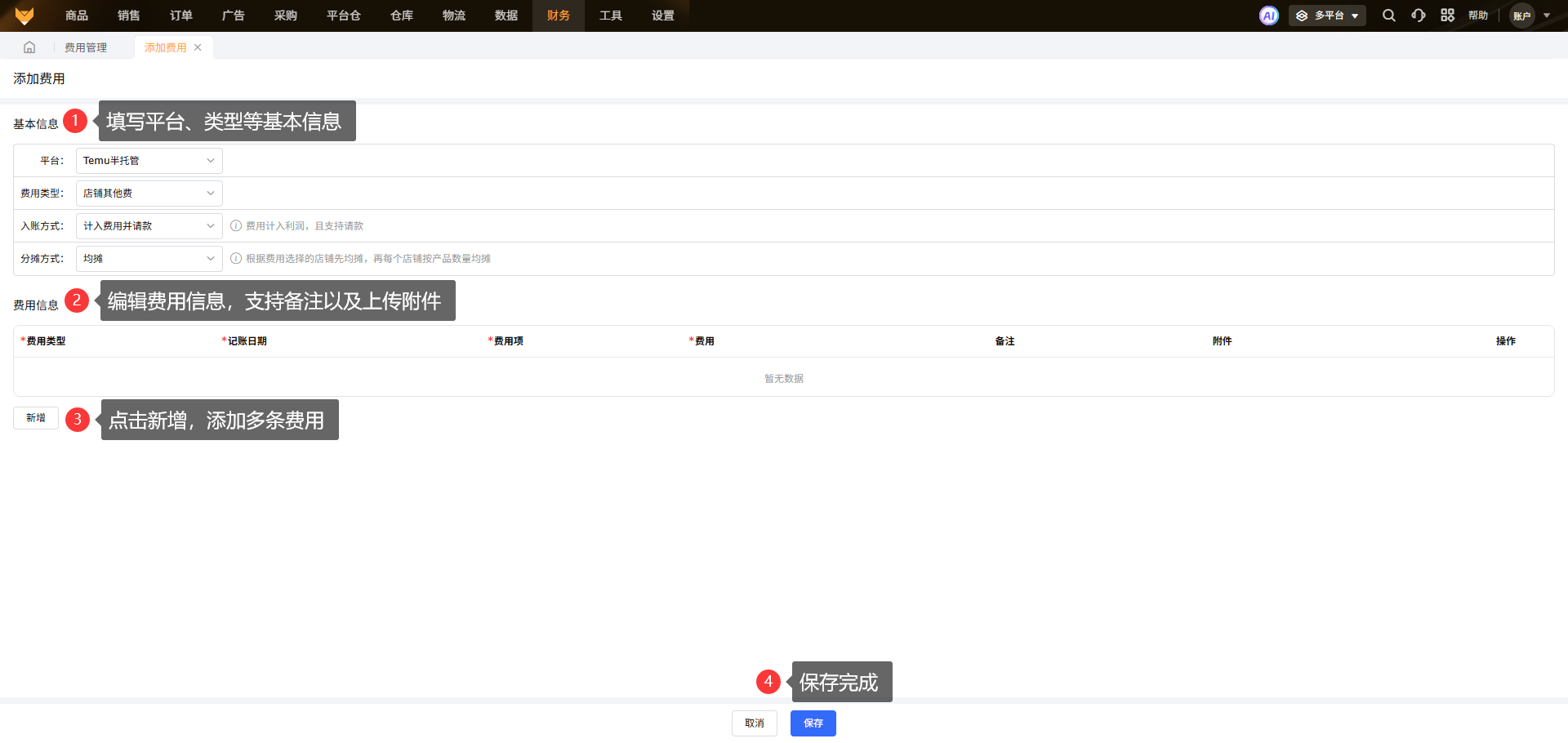 操作步骤:【点击添加费用→选择平台→选择费用类型→选择分摊方式→填写费用信息→保存】