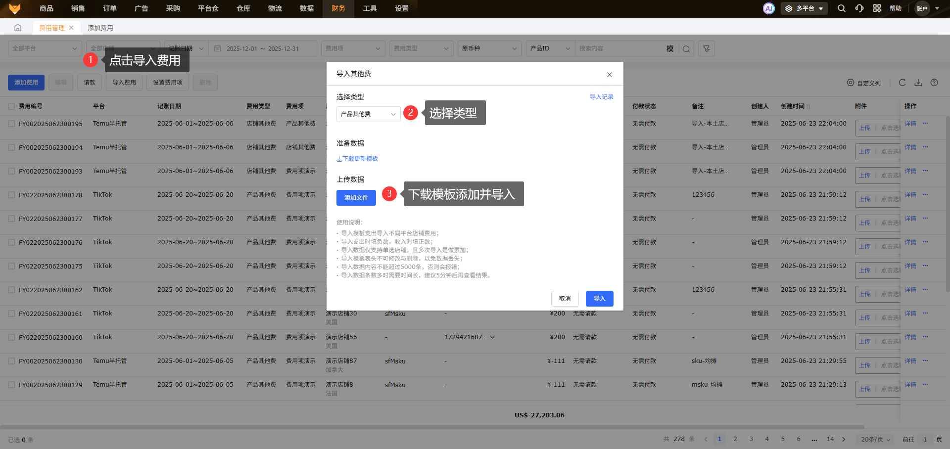 在多平台利润报表以及各个平台的利润报表页面导入的费用会在费用管理里展示, 相应的在费用管理里导入的费用会在财务利润报表里体现,展示在自定义费用下。